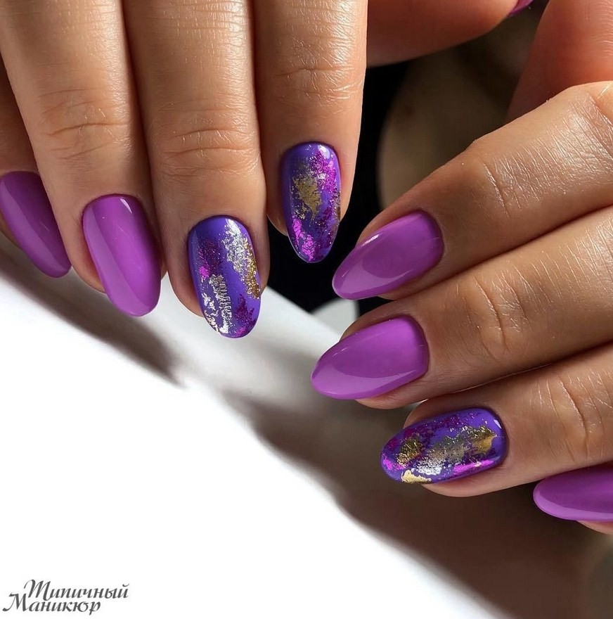 Фиолетовый и золотой цвет создают роскошное и элегантное сочетание. Вы можете использовать золотистые акценты, например, золотистые блестки или линии, чтобы добавить шик и блик к фиолетовому маникюру.