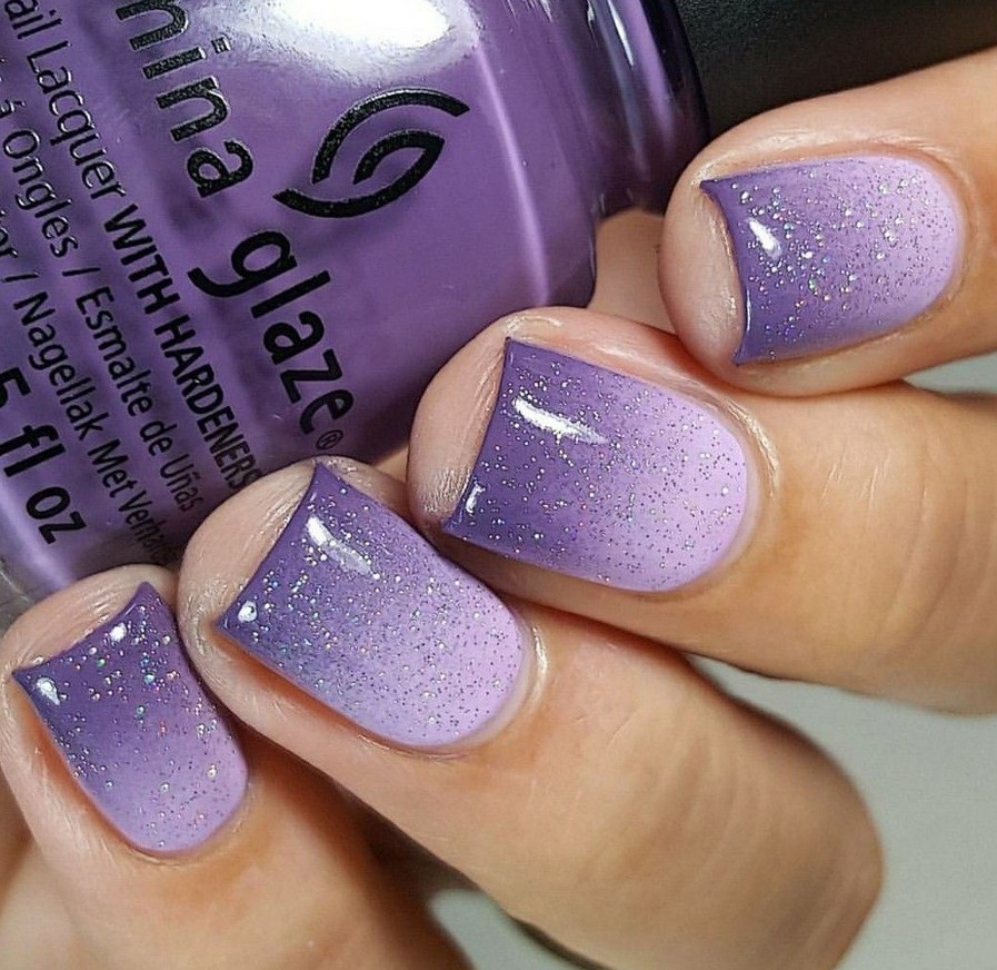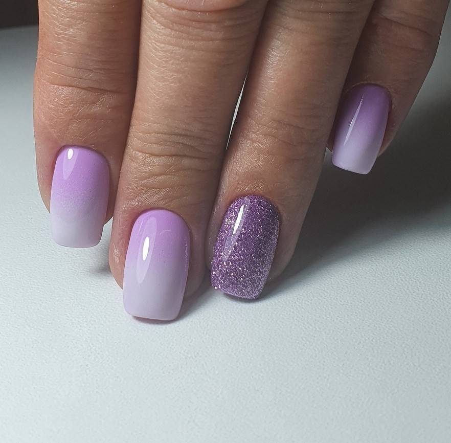 Также сиреневый градиент на ногтях можно сделать с разной фактурностью – матовым или глянцевым лаком, с пудровым покрытием.