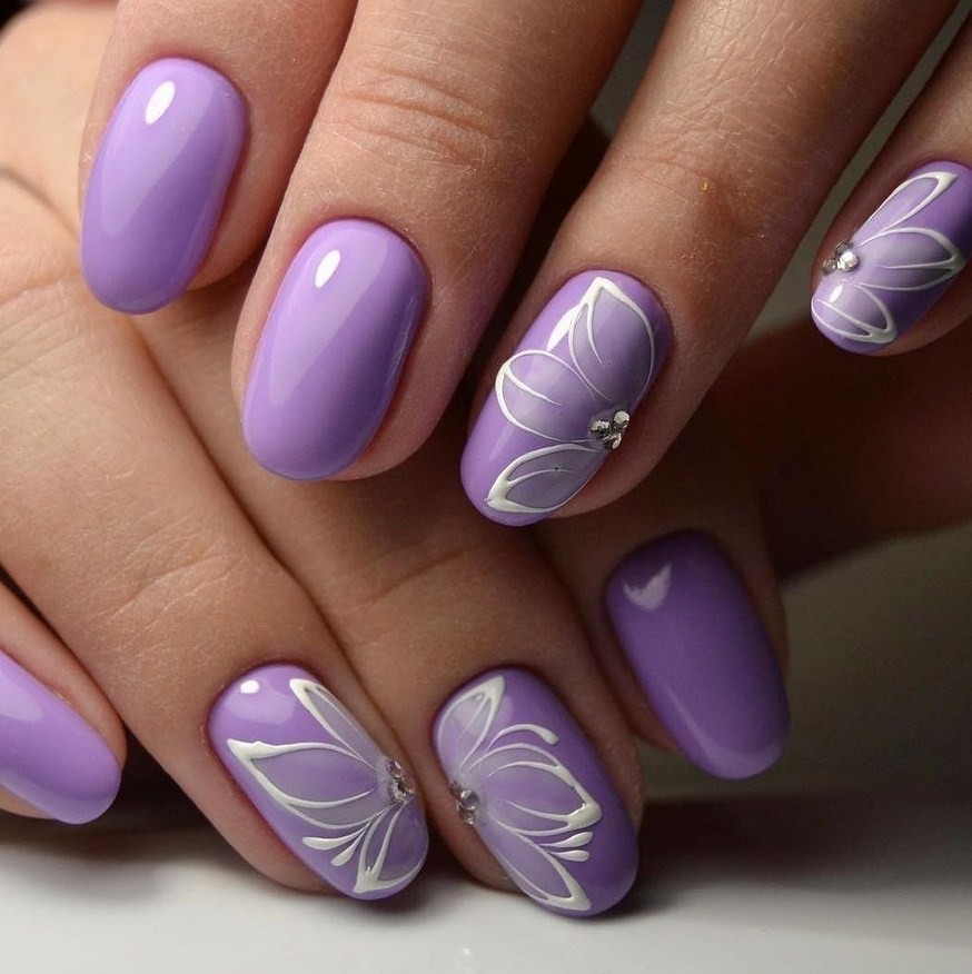 Маникюр в сиреневых тонах смотрится потрясающе даже при нанесении простого однотонного покрытия, является женственным и элегантным. Он хорошо подходит молодым девушкам и женщинам постарше, визуально освежает образ. И все-таки в новом году просматривается тенденция к выполнению сиреневого маникюра с дизайном. Такой нейл-арт более оригинальный и считается особенно актуальным с приходом весны.