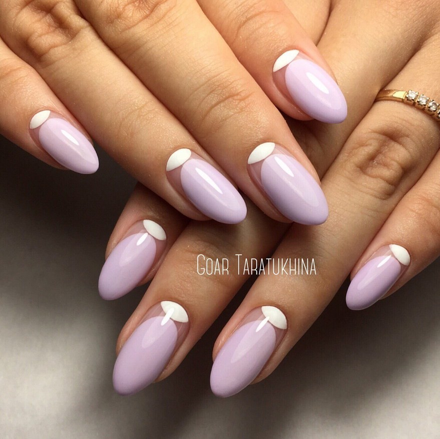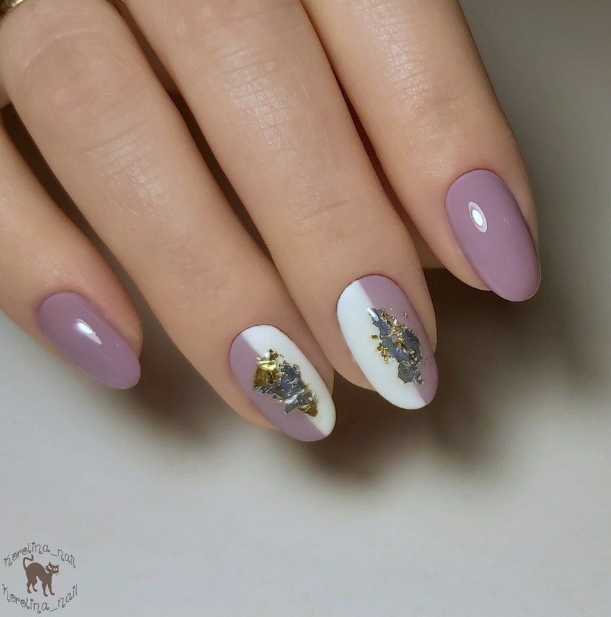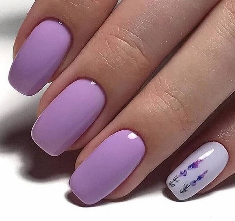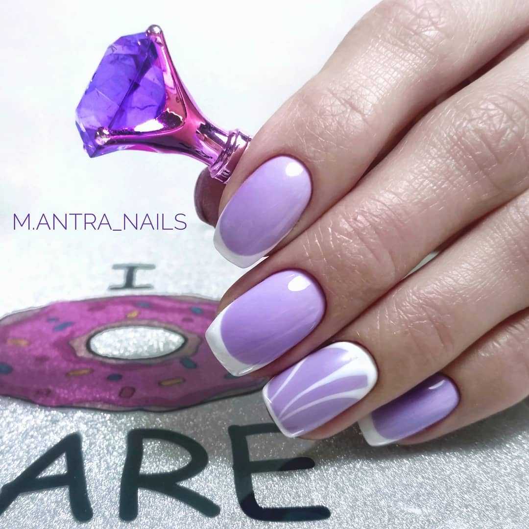 Сочетание сиреневого и белого цветов — это очень свежий и летний вариант. Вы можете использовать сиреневый цвет в качестве основного, а белый — для создания акцентов или узоров на ногтях.