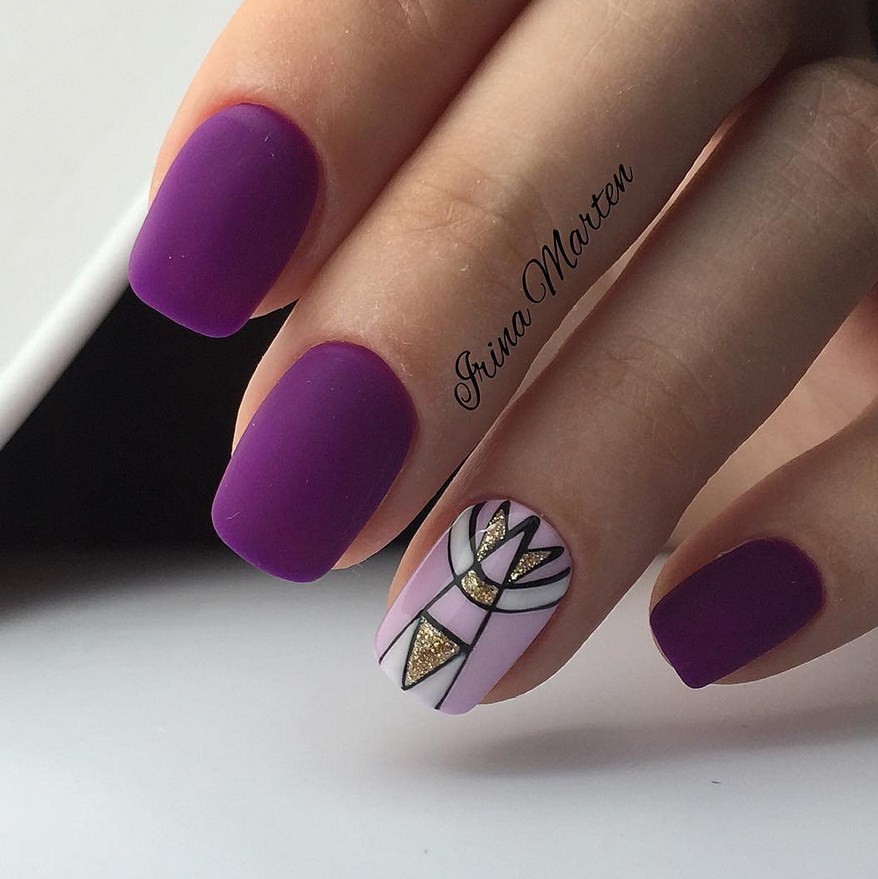 Новинки фиолетового маникюра в этом сезоне пополнились в первую очередь интересными идеями, связанными с геометрическими узорами. Такие узоры всегда в тренде. Время от времени меняются лишь детали, принцип работы с геометрией остается неизменным.