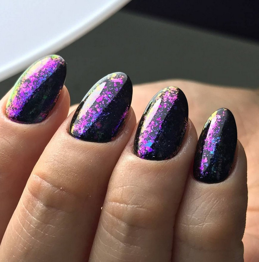 Космос — эффектный, но при этом крайне простой дизайн. Для его выполнения нужно всего лишь создать хаотичные разводы несколькими оттенками фиолетового на черной подложке, а затем нарисовать белые звездочки при помощи тонкой кисти.