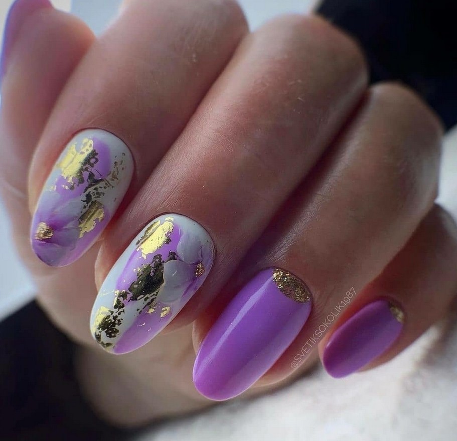 Сочетание сиреневого и золотого цветов — это роскошный и гламурный вариант. Вы можете использовать золотой цвет для создания узоров или для нанесения акцентов на ногти с сиреневым маникюром.