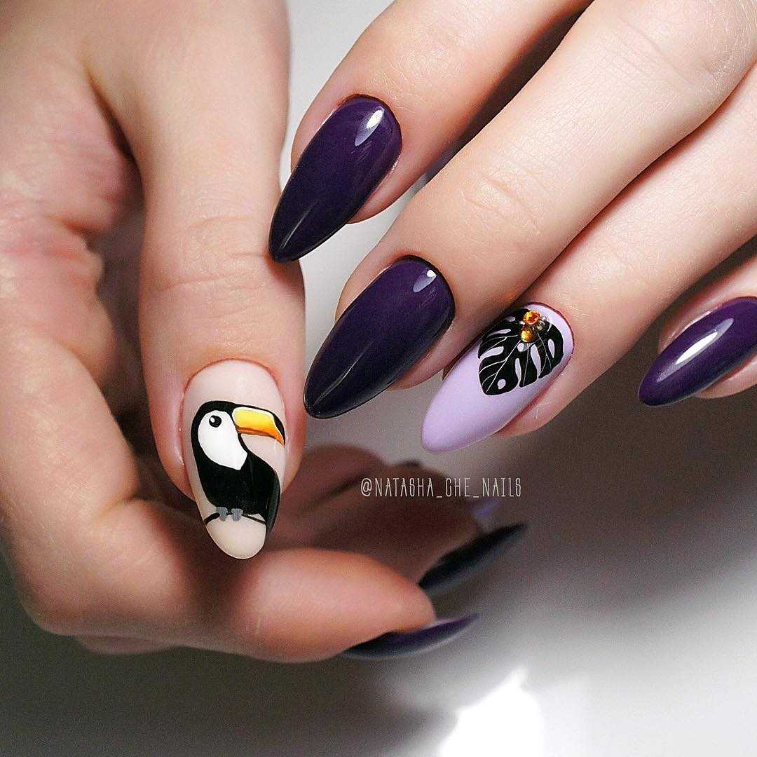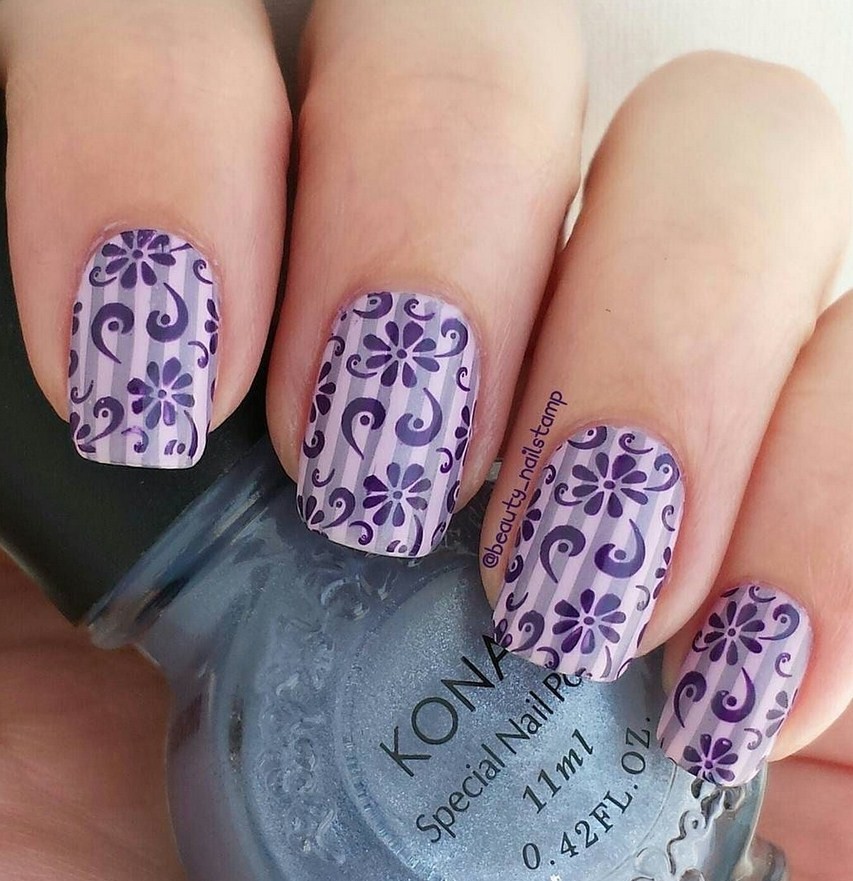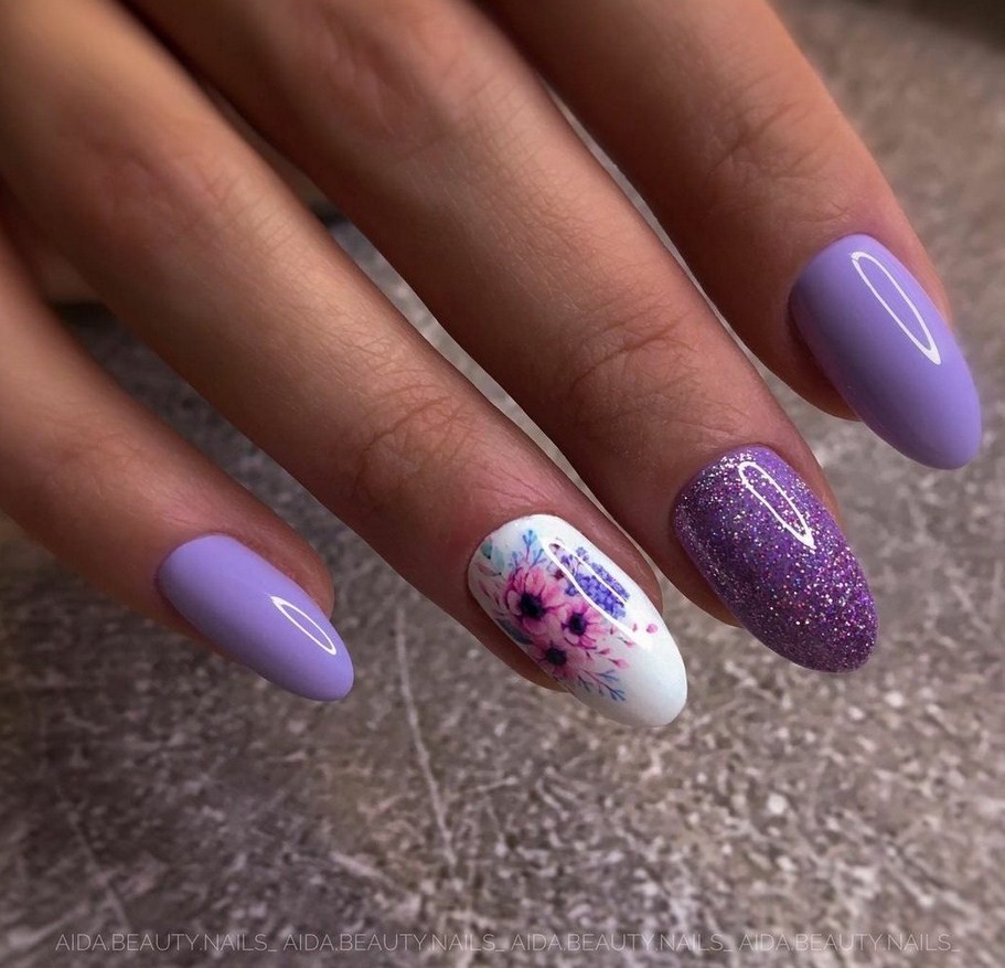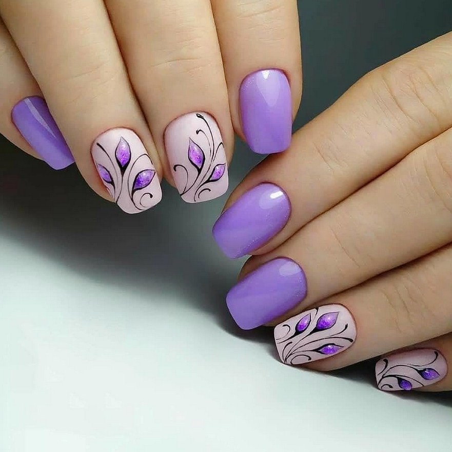 - фиолетовые цветы: используйте фиолетовый лак, чтобы нарисовать или нанести наклейки с цветочным дизайном на ногти. Это придаст им женственный и романтичный вид;