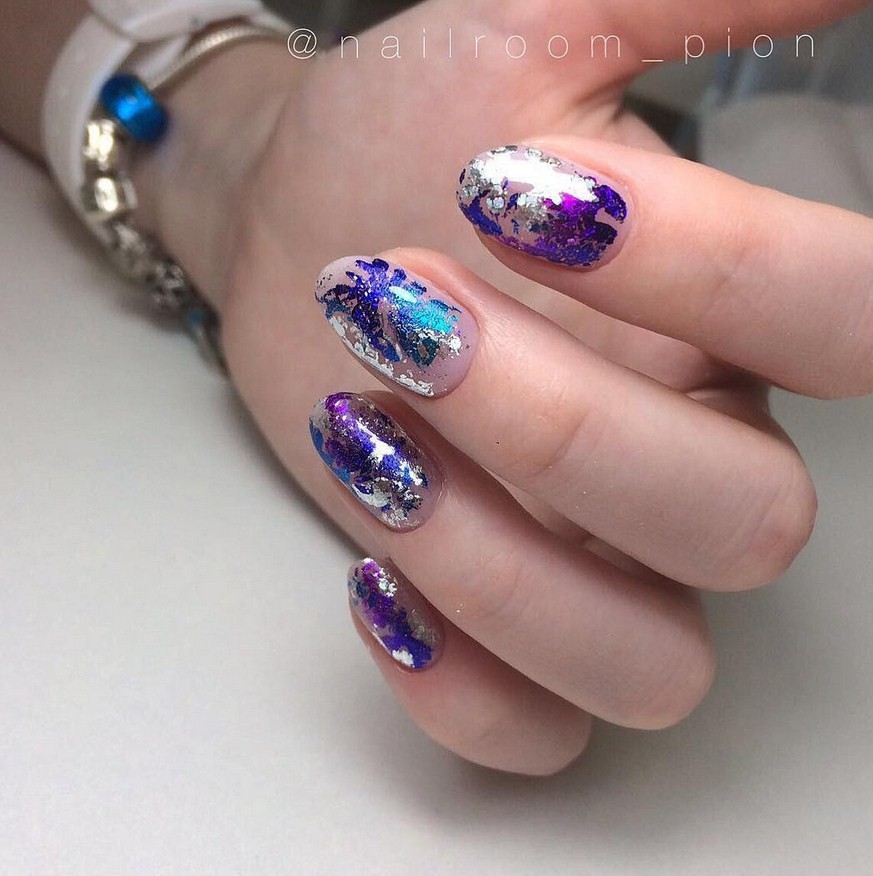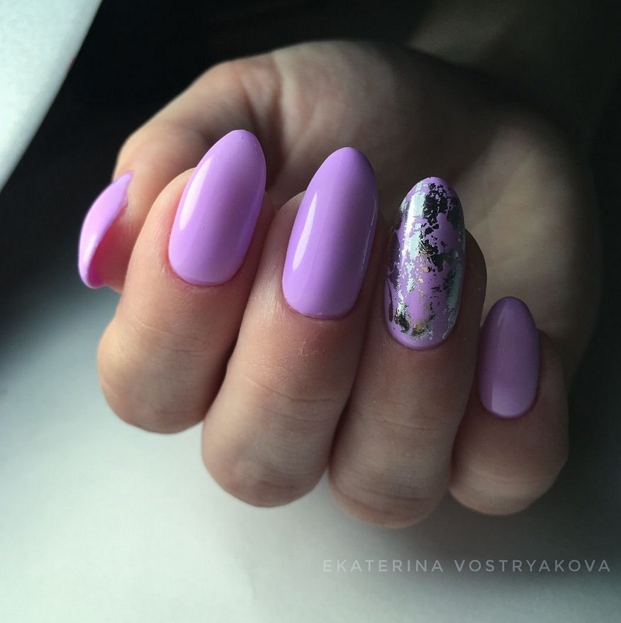 Кусочки металлического декора помогут украсить простой однотонный маникюр, если хочется сделать его более разнообразным. Фольга даёт шикарные сочетания с сиренью, причём как в серебристом, так и в золотом цвете.