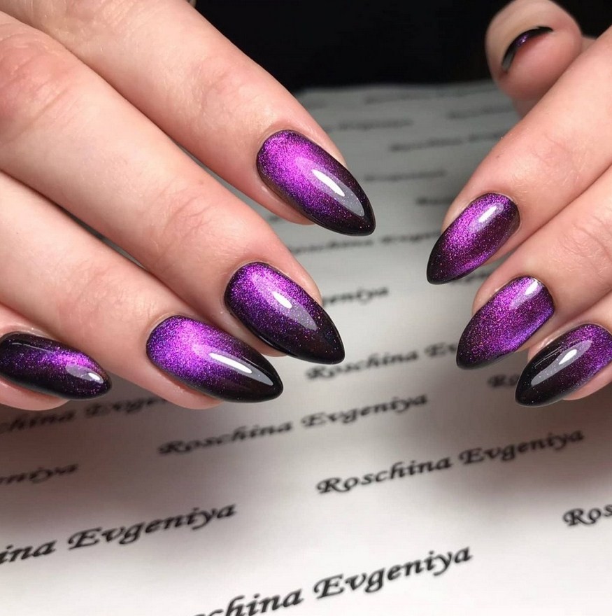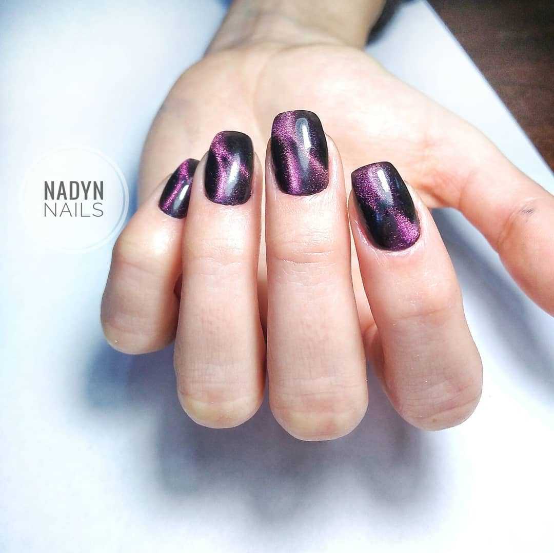 Такой дизайн выполняется с помощью особого лака с металлическими частицами. После поднесения магнита они красиво распределяются по поверхности и формируют необычный рисунок. Обычно для получения таинственного нейл-арта используют магнитный лак тёмно-сиреневого оттенка.