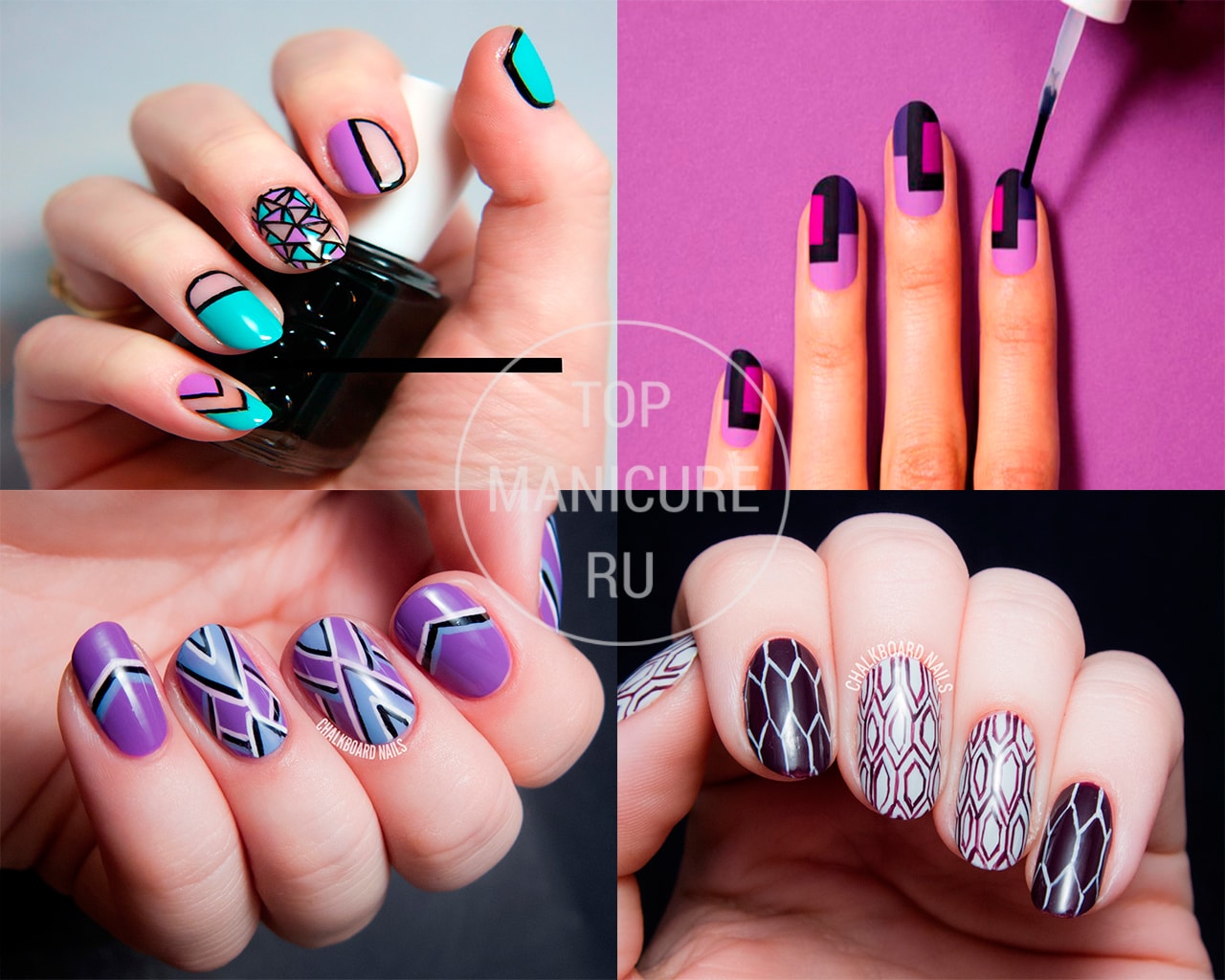 Фото 1. Здесь мы видим фиолетово-мятный маникюр с геометрическими орнаментами и негативным пространством. Для создания такого дизайна понадобятся трафареты. Указательный палец окрашен лишь наполовину. Чтобы сделать так же, нужно заклеить одну половину ногтя скотчем или липкой лентой, а на вторую половину нанести лак. То же самое делается и с безымянным пальцем, только часть ногтя заклеивается у основания ногтя. Для мизинца используется трафарет в виде треугольника. Можно самостоятельно вырезать его из скотча. Что касается дизайна среднего пальца, то он рисуется черным фломастером для ногтей. Можно закрасить часть треугольников фиолетовым и мятным лаком. Такое сочетание оттенков смотрится очень симпатично.
