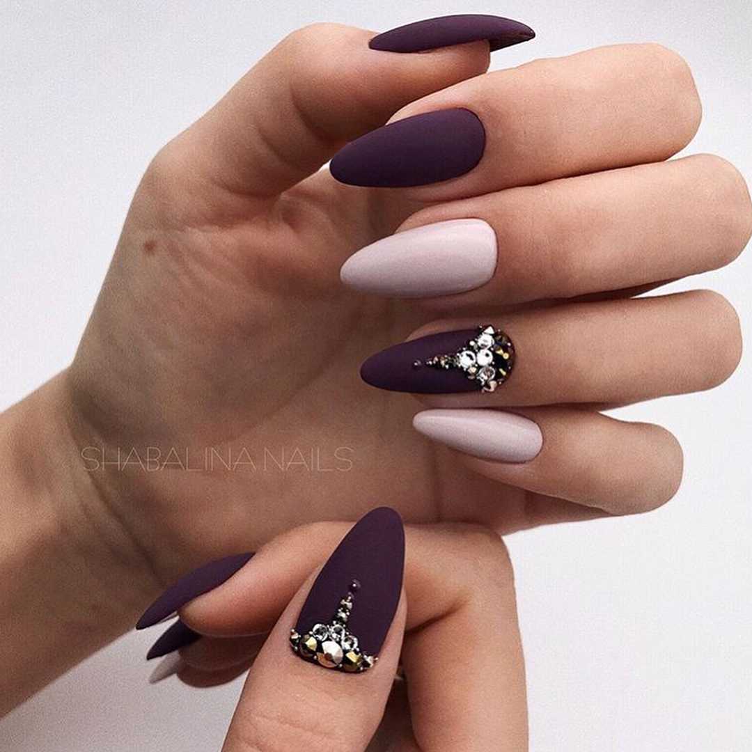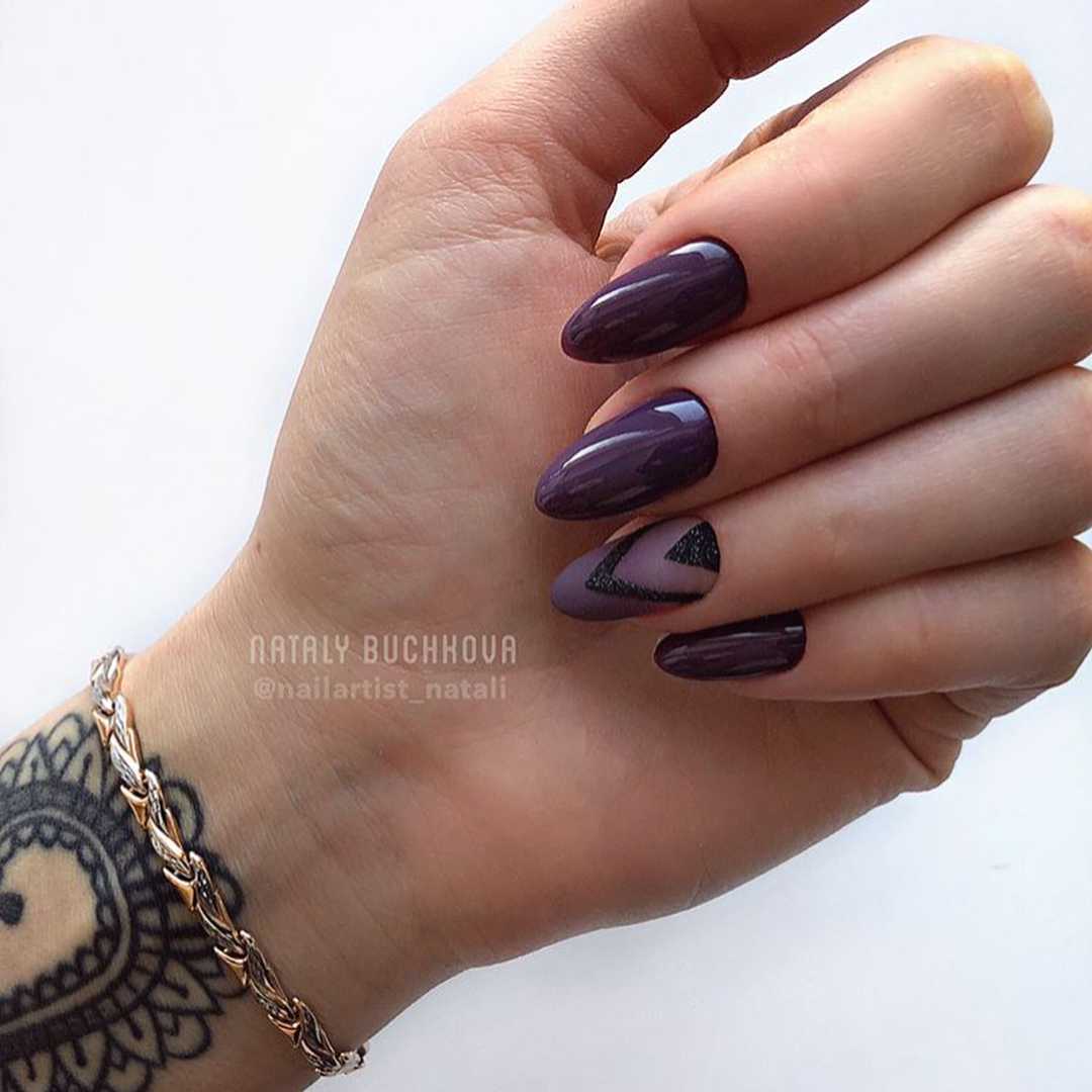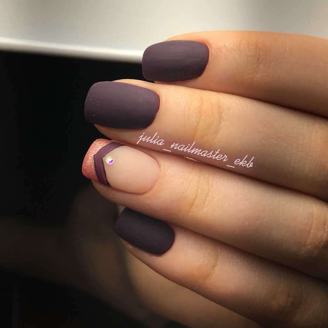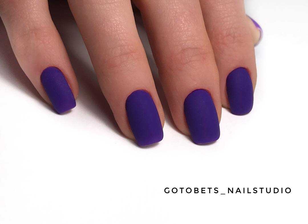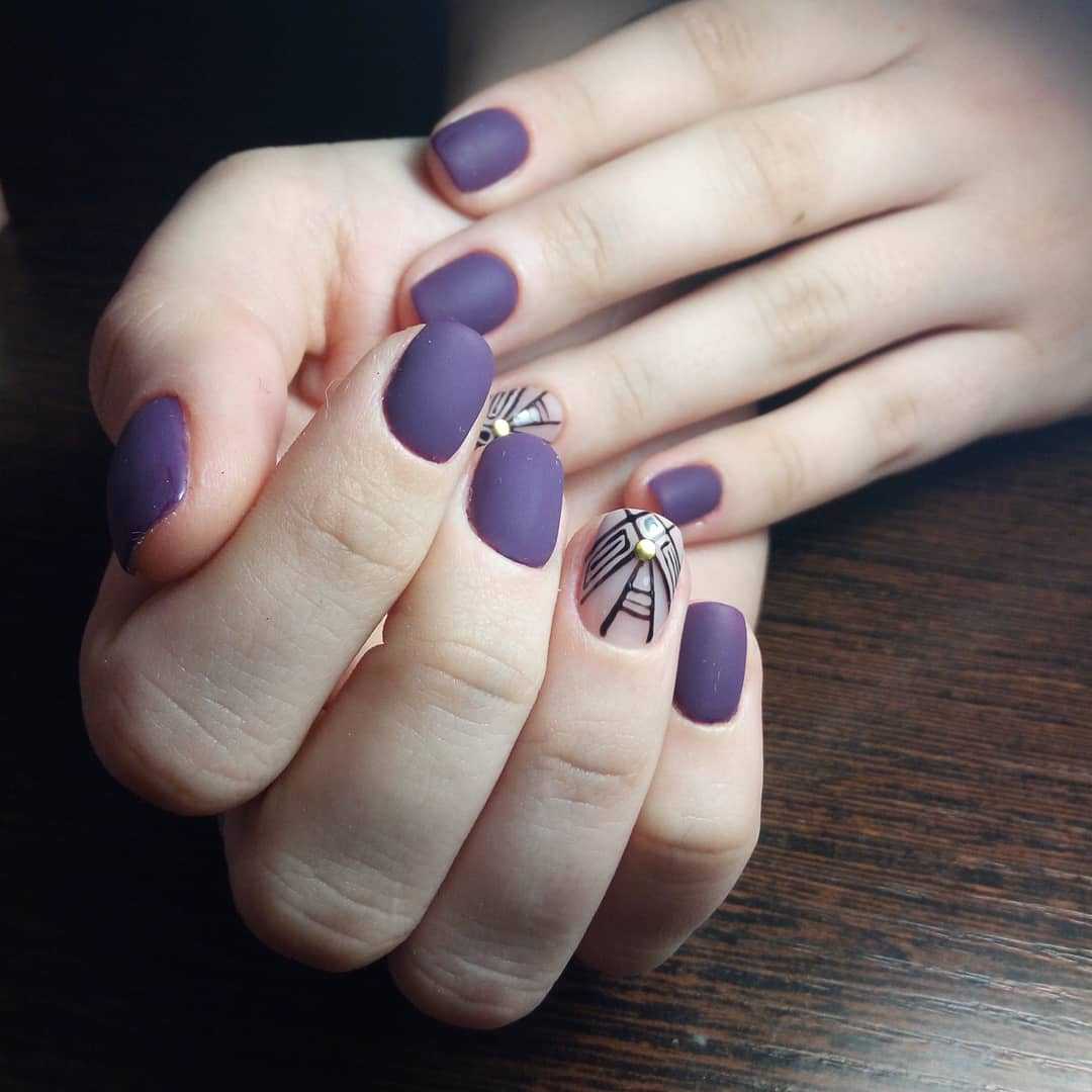 Матовые фиолетовые ногти сейчас на пике популярности. Невзирая на то, что фиолетовый и сам по себе достаточно глубокий, интересный и насыщенный цвет, под слоем матового топа он смотрится еще более привлекательно и оригинально. Для wow-эффекта чередуйте глянцевые и матовые элементы.