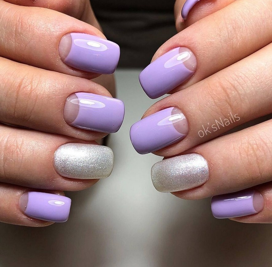 - фиолетовый френч: попробуйте классический френч-маникюр, используя фиолетовый лак в качестве основного цвета и белый лак для подчёркивания кончика ногтя;