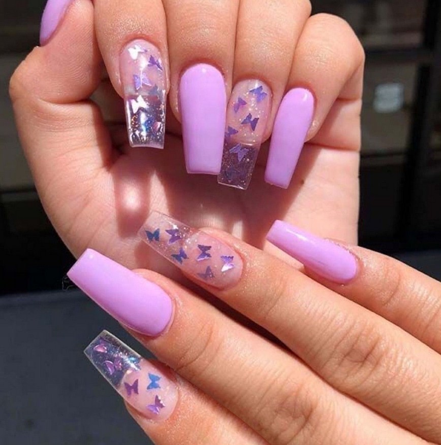 Отличная идея и модный тренд маникюра в 2023 – акварельный дизайн, выполненный полупрозрачным лавандовым лаком. Не менее интересным и нежным будет маникюр с полностью прозрачным покрытием со светло-сиреневыми цветками – фиалками, ирисом, сиренью.