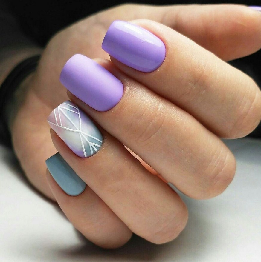 - Для модного нейла-арта комбинируют фиолетовые и мятные оттенки с негативным пространством. Для создания сложных геометрических узоров потребуются трафареты. Чаще всего, на поверхности рисуют россыпь треугольников или квадратов разной формы, каждый из которых окрашивают в хаотичном порядке;