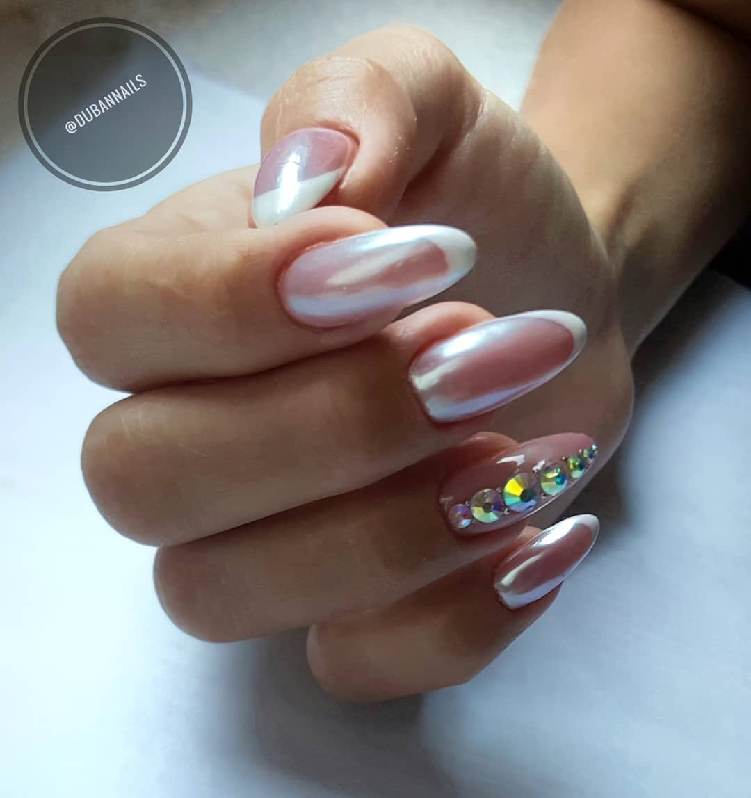 Отдельно стоит отметить втирку, которая дает невероятной красоты жемчужный блеск на ноготках. Такой эффект достигается благодаря металлизированным частицам. Одно из главных преимуществ такого декора – это то, что блеск в основном проявляется только на солнечных лучах.