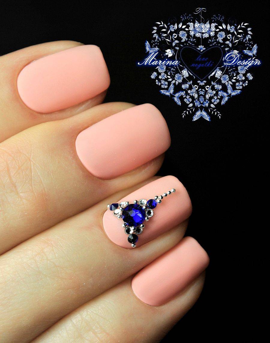В летнем дизайне ногтей красиво смотрится инкрустация одного из ноготков серебряными или цветными стразами. Используйте стразы не только круглой или ромбовидной формы, но и разнообразные варианты в виде звездочек, конусов и другие. Среди нейтральных нейл-артов можно выделить нейл-арты с коронами, украшенными стразами.