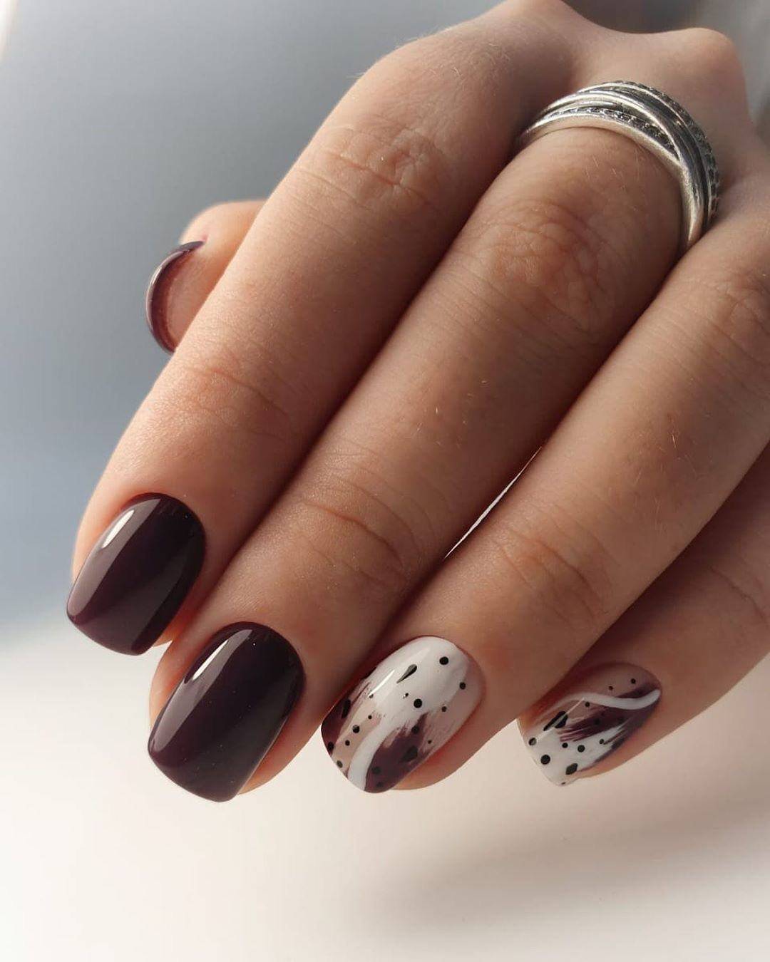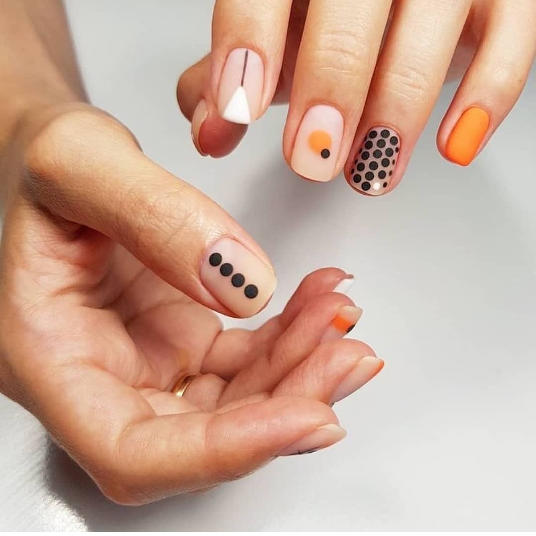 Смотрится удачно практически в любом исполнении. Нравится тем, кто приветствует детализацию, выбирая строгие линии, фигуры, рисунки точек дотсом, крестики, штрихи. Если вы не в их числе, то смотрите в сторону абстракции и общих форм. И тогда ваш маникюр будет модным и современным.