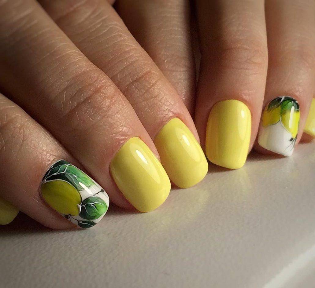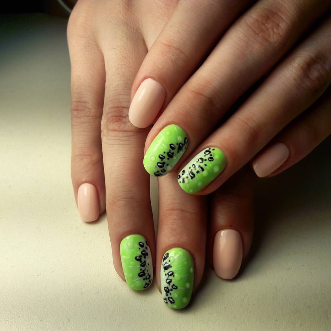 Самыми практичными, распространенными и востребованными украшениями коротких ноготков этим летом стали яркие фруктовые рисунки. Они прекрасно вписываются в летние образы, выглядят весьма заметно и ярко. Конечно же, на коротких ноготках фруктовые рисунки не всегда помещаются. В таком случае лучше всего выполнять всего дольку фрукта. Чтоб облегчить задачу используйте слайдеры. Чаще всего фрукты выполняются в разрезе. На ноготках короткой длины такой рисунок будет выглядеть значительно заметнее и ярче в сравнении с обычными фруктами. Можно украсить фруктовый маникюр глиттером, стразами, бульонками и другим декором. Фруктовые изображения лучше всего выполнять всего на нескольких ноготках, остальные окрасить в светлый или нежный оттенок.