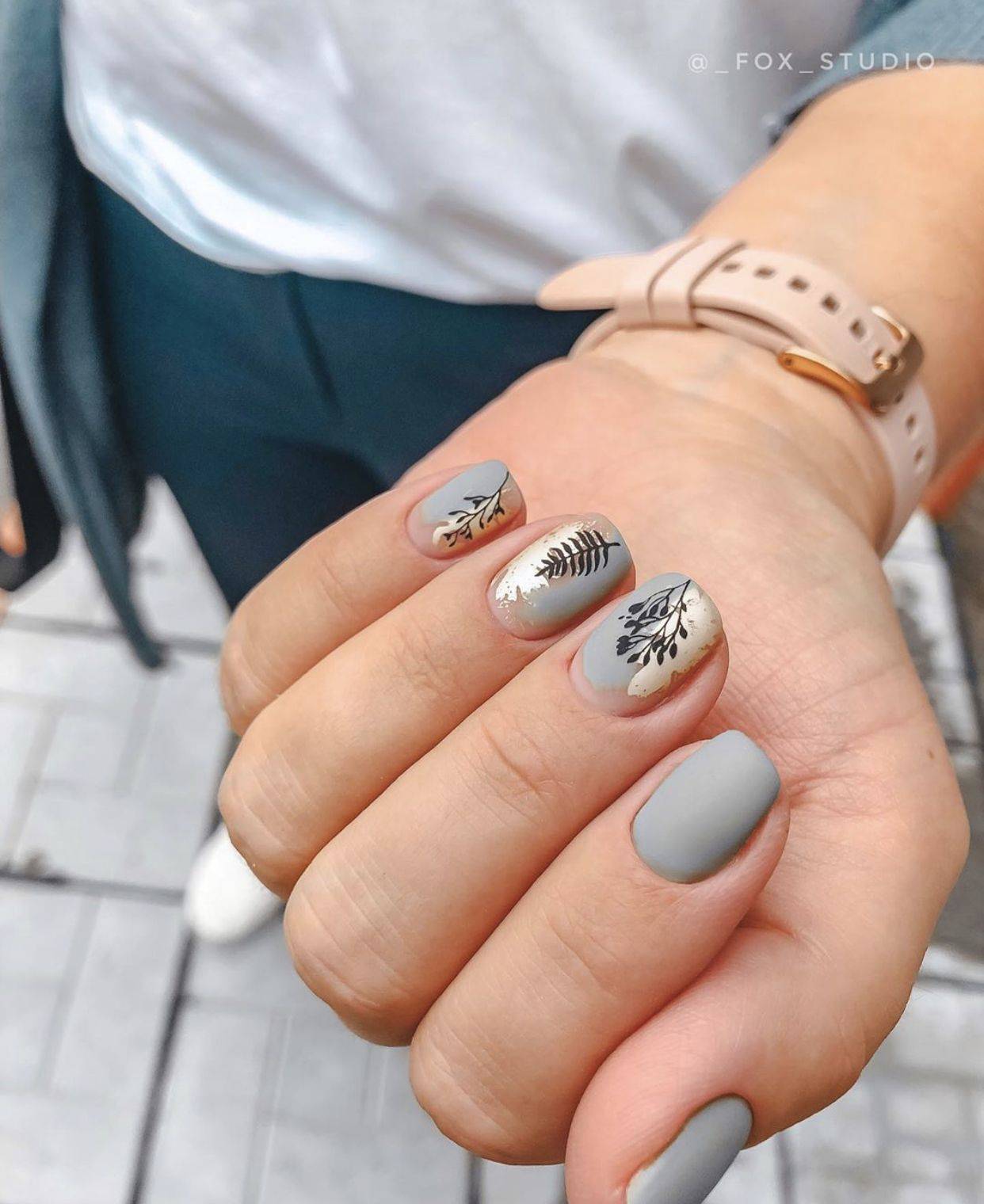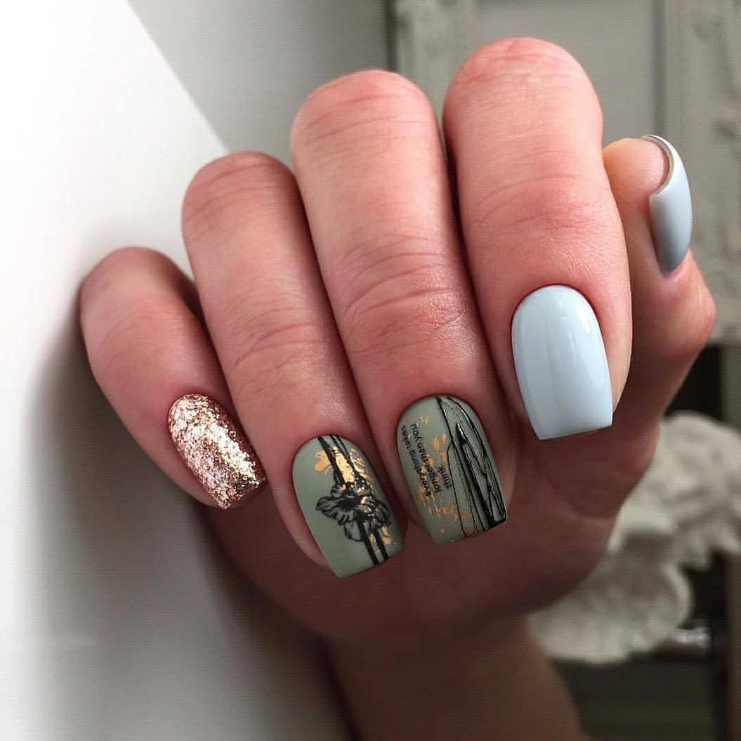 Если вы предпочли флористику, то цветы должны по цветовой палитре схожи с основным фоном. В маникюре с геометрией можно использовать серебряный или золотой глиттер, графитовый или серый оттенки. Также присмотритесь к нежному маникюру с надписями. Маникюр с серебряными словами отлично смотрится на сером или белом фоне.