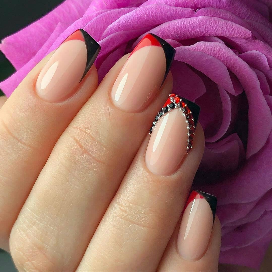 Прозрачные или цветные кристаллы — отличная идея для уверенной в себе девушки. И они могут стильно украшать короткие ногти — черное, нюдовое, молочное, красное покрытие. Такое изысканное дополнение крепится на клей по одному элементу. А если натуральная длина ногтей позволяет, то можно выполнить, например, line-дизайн.
