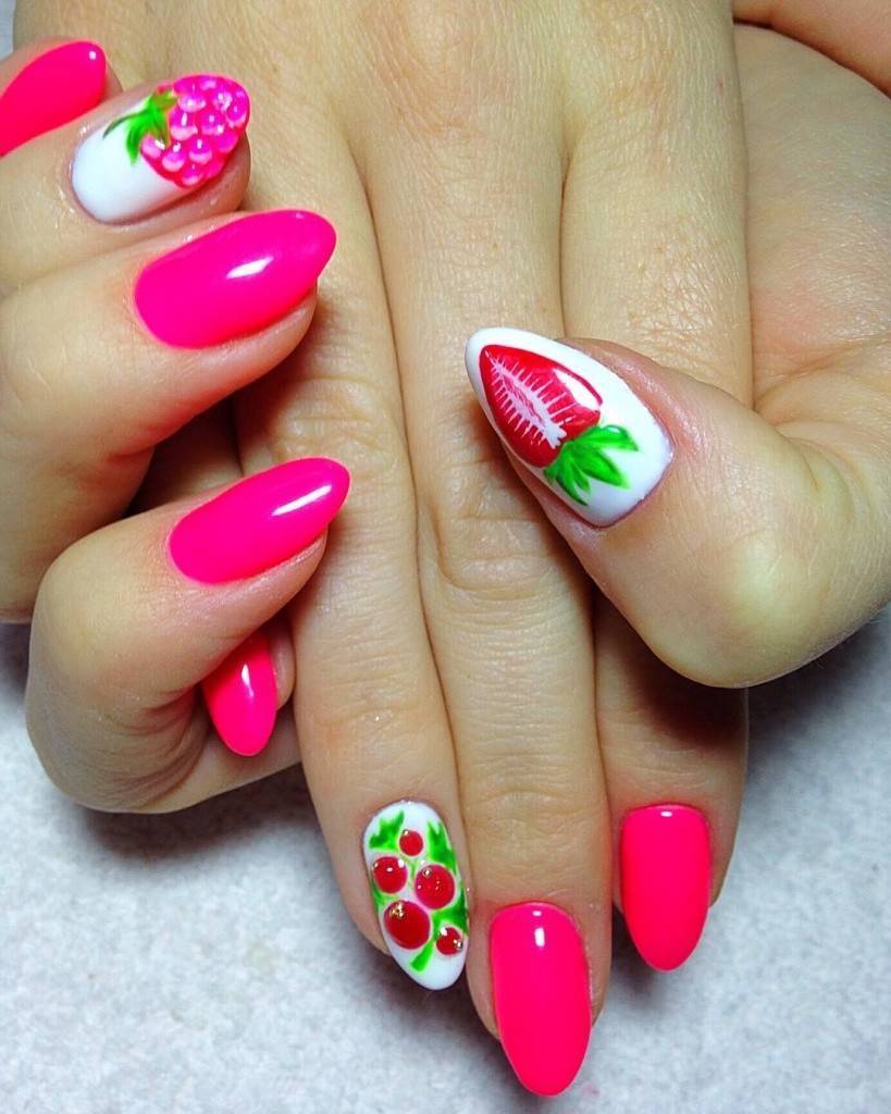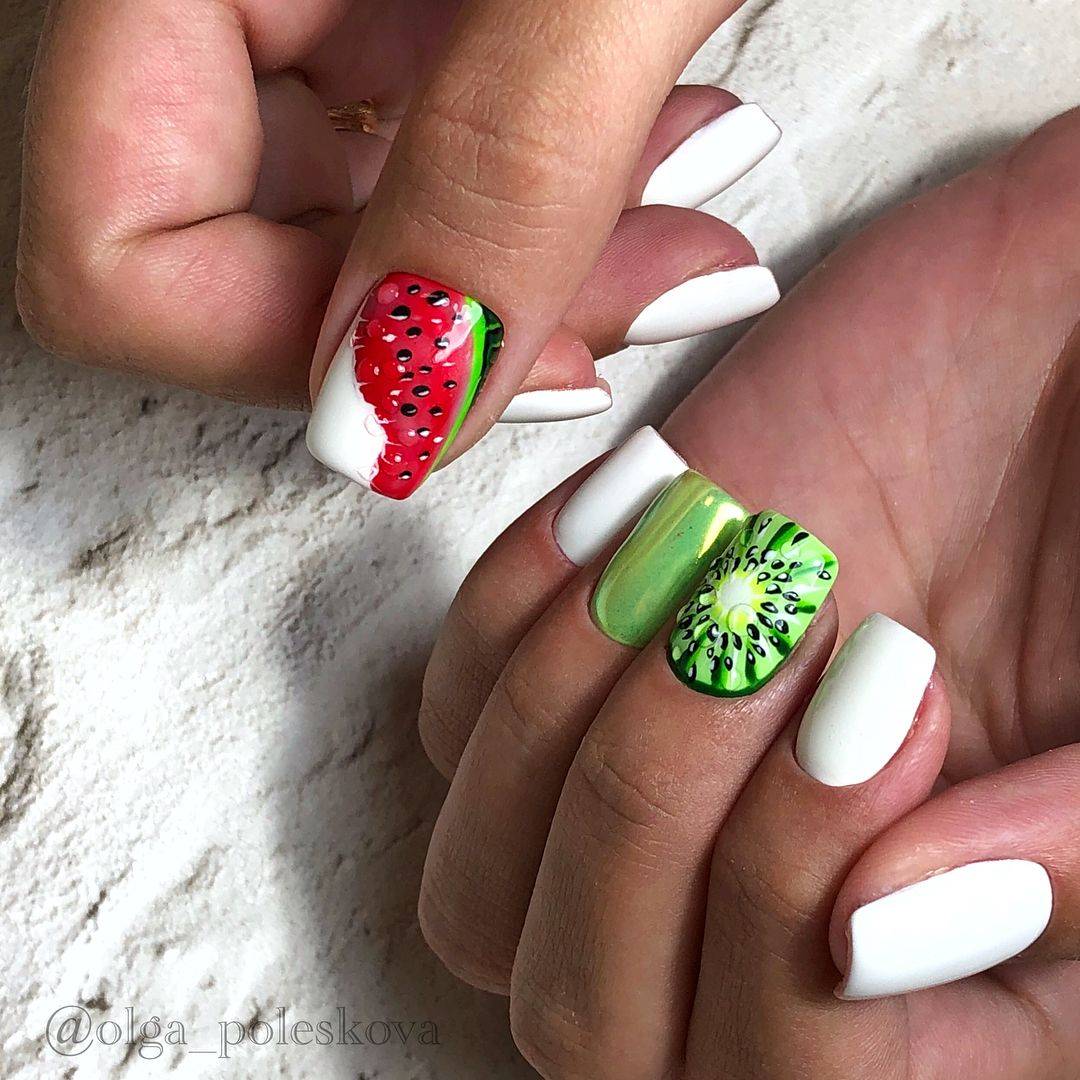 Не менее актуальным в летнем сезоне является сезонный фруктовый дизайн. Он отлично смотрится на ногтях любой длины и формы. Только представьте, насколько красиво в сочетании с бело-красным оформлением смотрится рисунок клубники, вишни или арбуза. Желто-белое покрытие часто сочетают с изображением бананов, ананаса, абрикосы и груши. С оранжевым маникюром лучше всего смотрится апельсин, а с розовым — малина. Какой бы вариант вы ни выбрали, главное — правильно разместить дизайн.