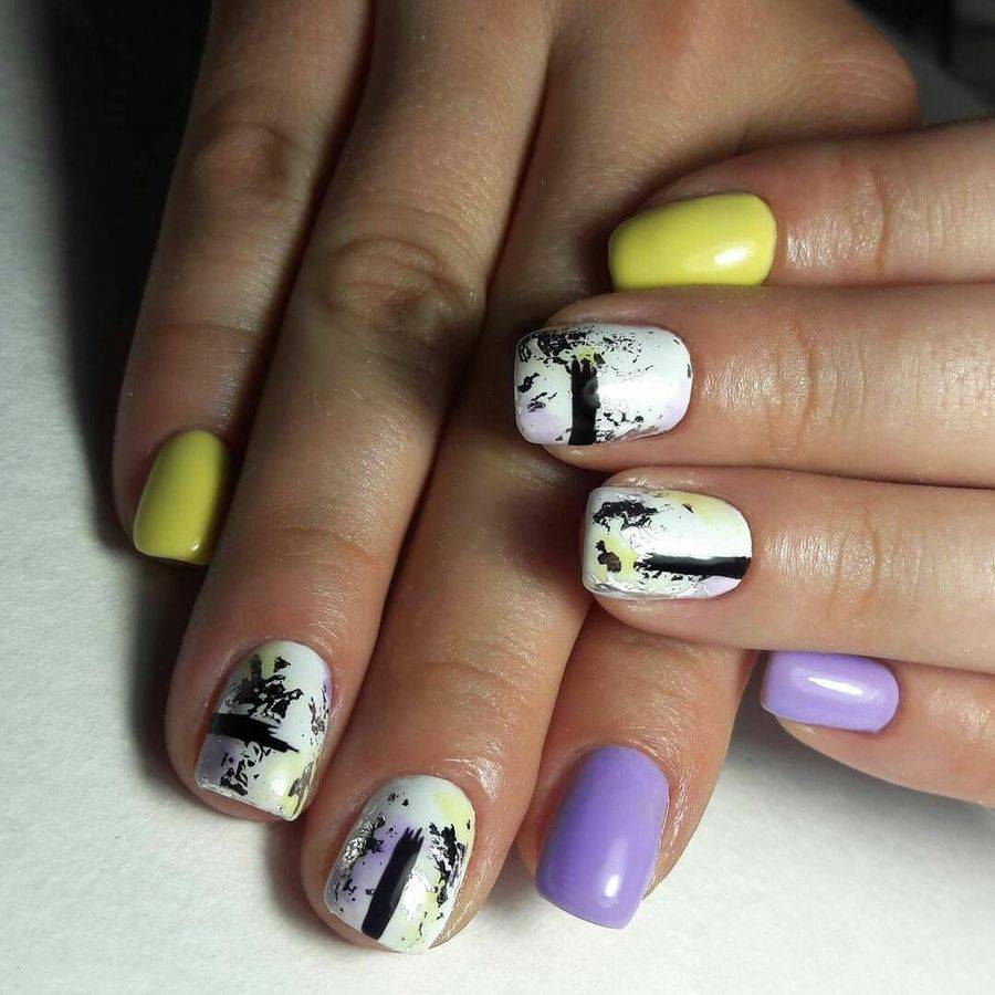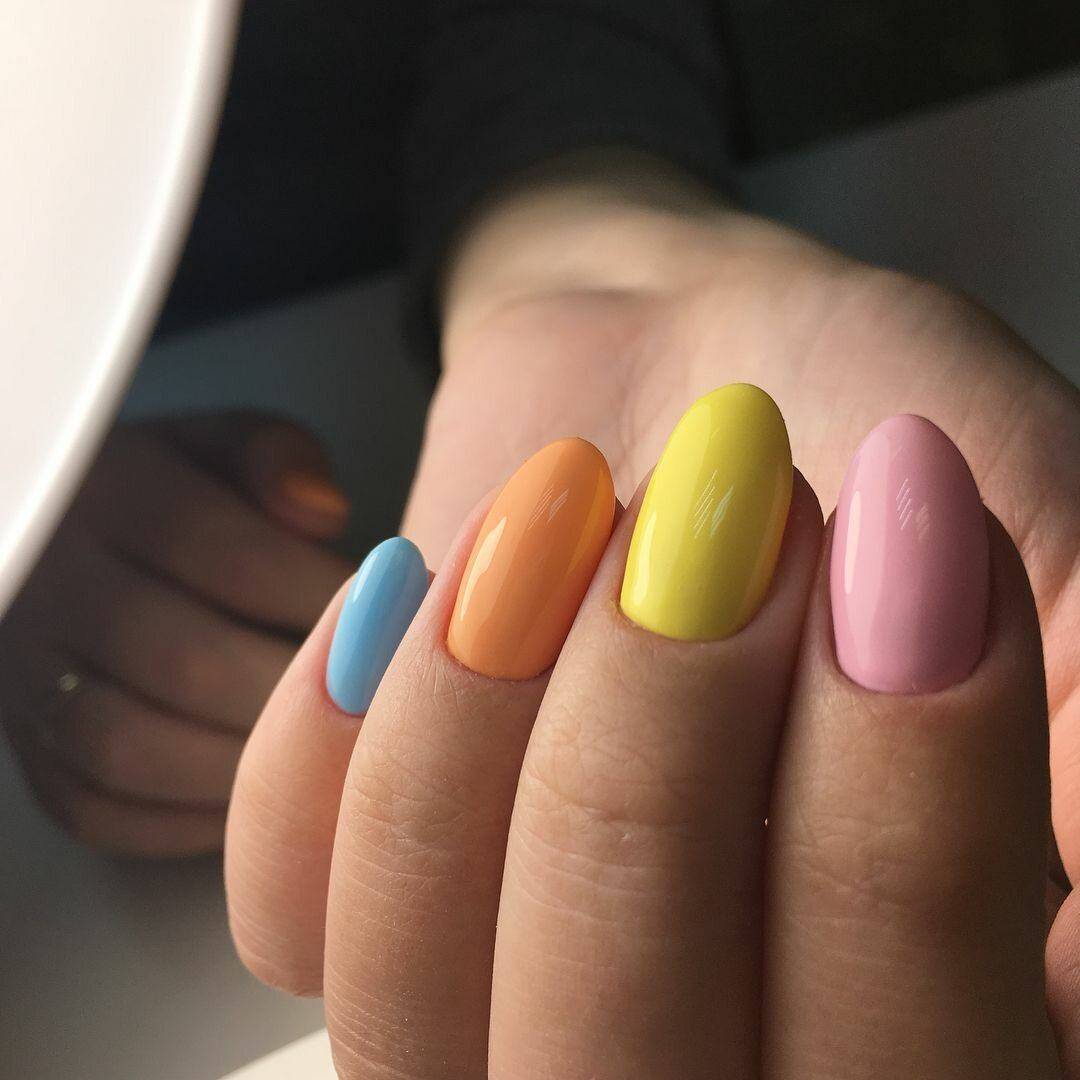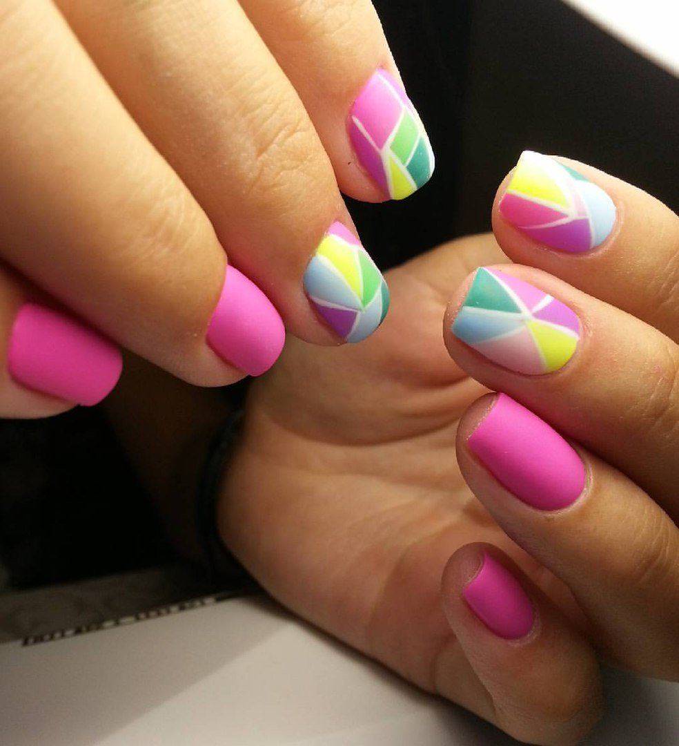 Самый простой, но оттого не менее красивый способ украшения коротких ногтей — летний дизайн с неоновыми оттенками. Лунный маникюр, неоновые мазки/кляксы на прозрачном покрытии или разноцветная радуга из гибких ленточек — решать вам. Весенний вариант с пастельными оттенками и единичными рисунками веточек/цветов, сердечек сделает маникюр эстетичным.