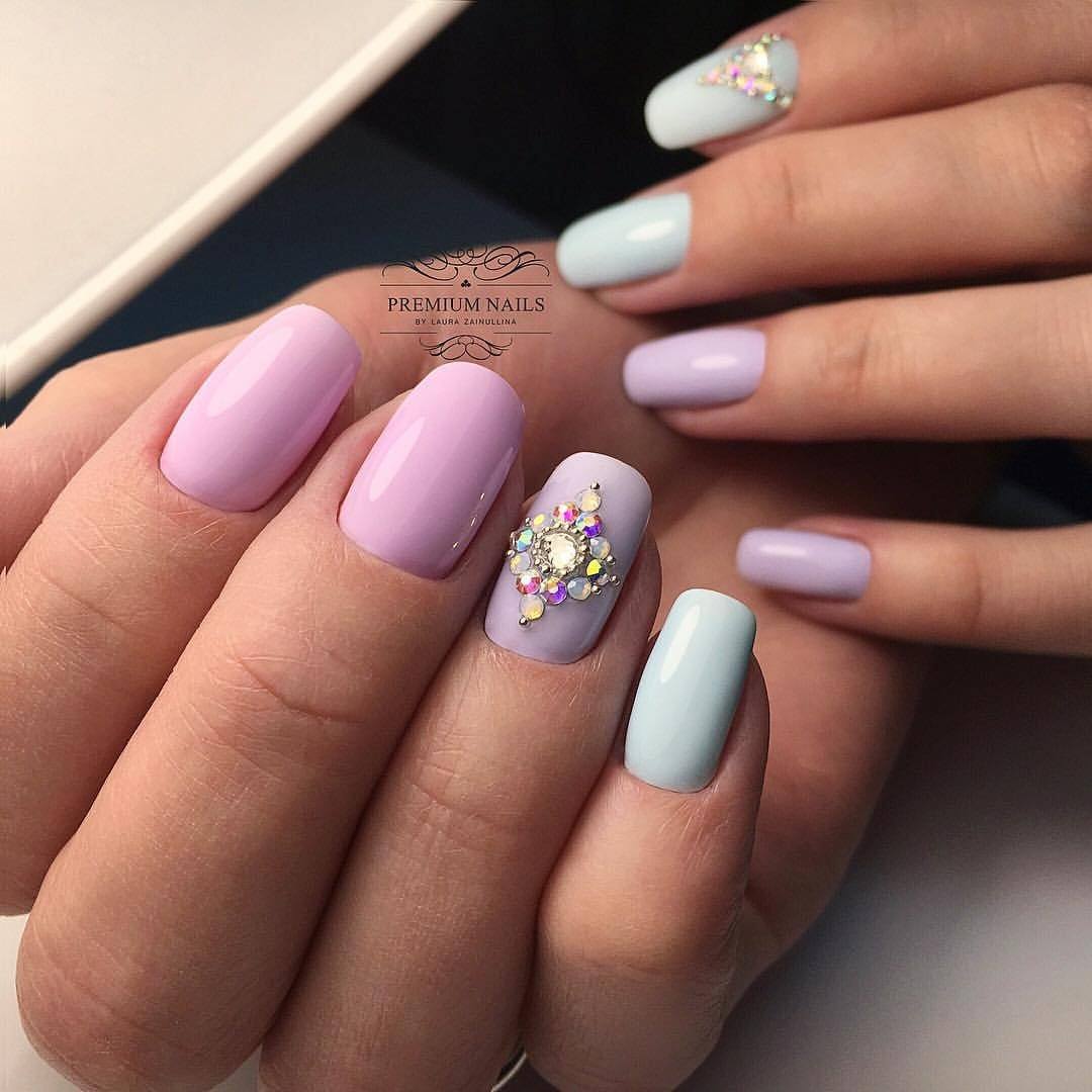 Нежная пастельная цветовая гамма определенно больше подходит для экспериментов. Здесь вы вряд ли получите смелые и неожиданные сочетания. Но в то же время, будете уверенны, что маникюр получится достойным. Согласно модным тенденциям, украшать покрытие рисунком или декором не обязательно. Выбирайте тот вариант, который больше всего подходит к образам.