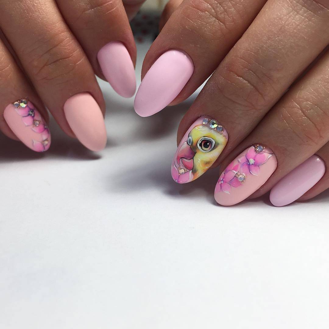 В весенний период времени практически все красавицы стараются достичь главной цели — выглядеть восхитительно и модно. Для этого не нужно иметь слишком большие ноготки. Что касается весеннего маникюра, то его в последнее время украшают при помощи светло-сиреневого, серого, нюдового и розового оттенков. В качестве дизайна стоит использовать нейл-арт в виде рисунков. Орнаменты имеют весеннюю тематику: тюльпаны, веточки деревьев, сирень, расписные бутоны пионов. Также не стоит забывать о геометрическом дизайне. Этот стиль декорирования занимает главную позицию в современном дизайне маникюра.