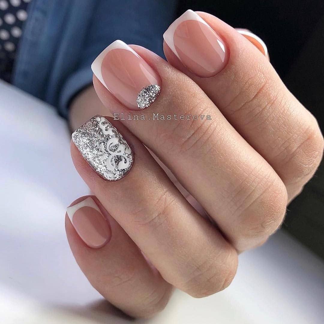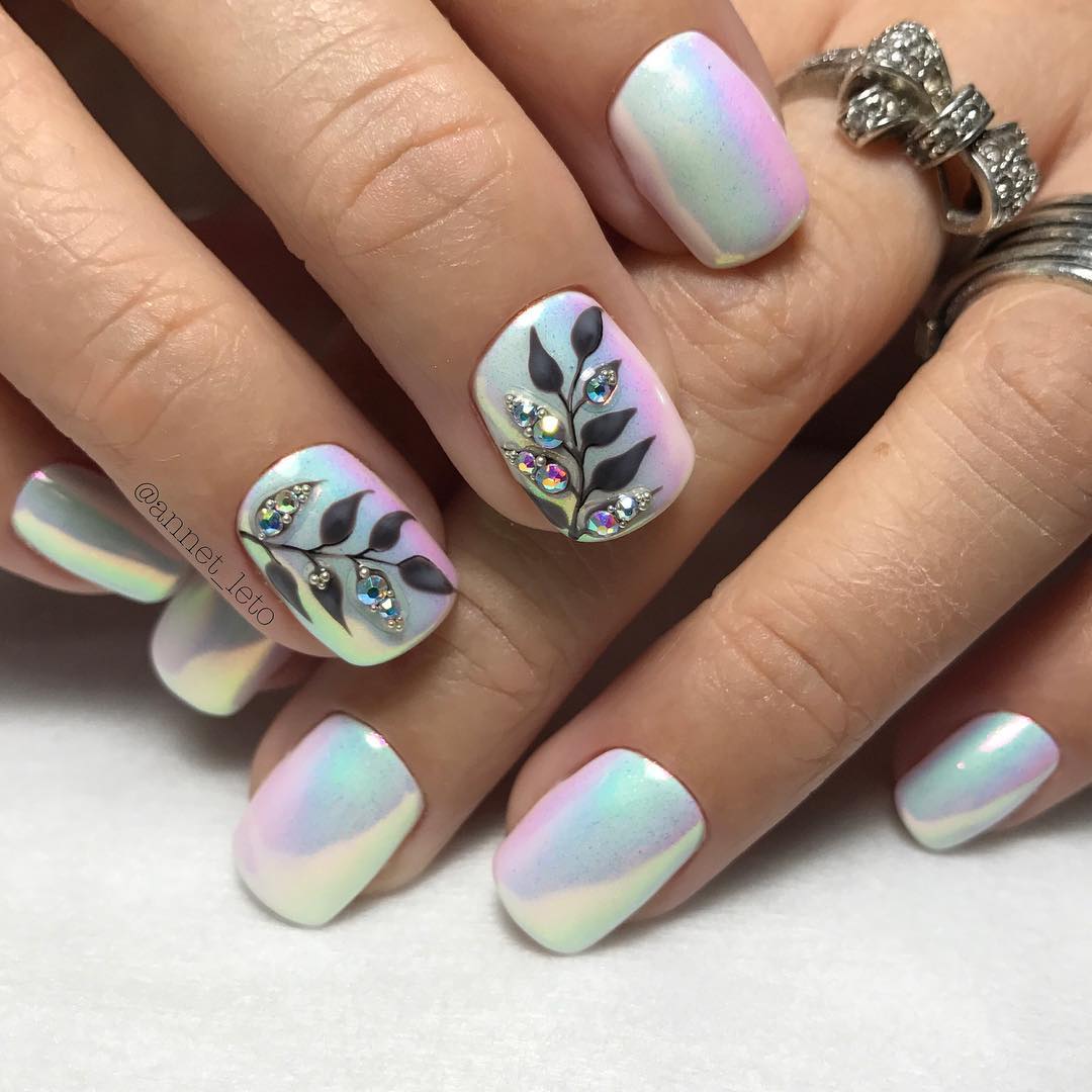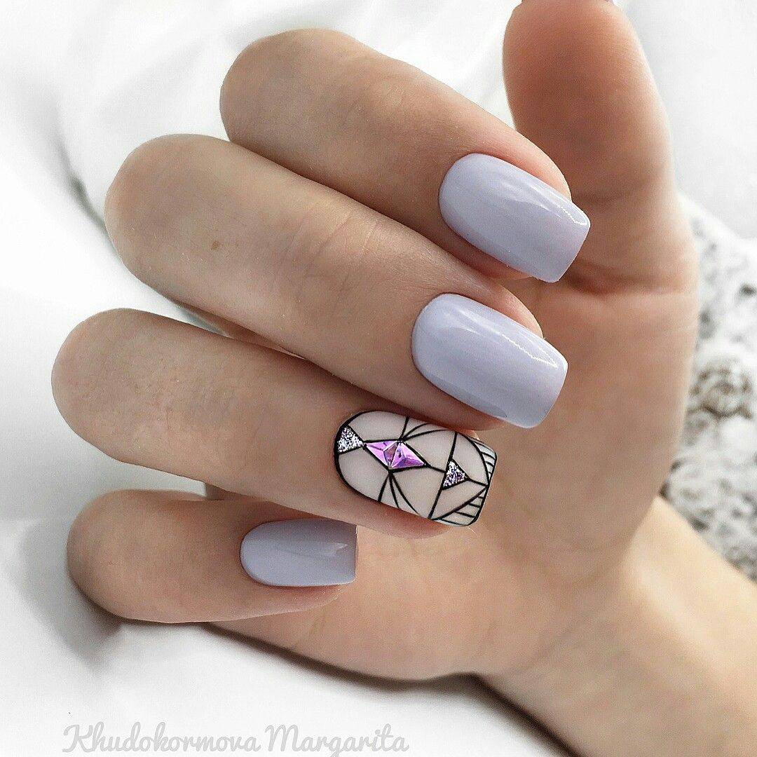 Нежность в этом году имеет светлые тона, сияющий декор в виде битого стекла, фольги и втирки, однотонные покрытия, покрытия — тонирование (разными лаками) и минималистические узоры с геометрическим орнаментом. Светлый маникюр на коротких ногтях смотрится очень гармонично.