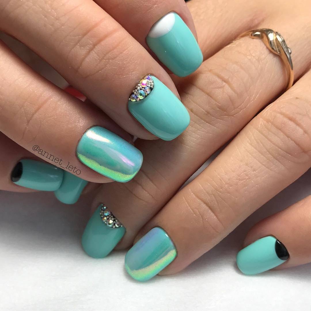 В модном ногтевом дизайна остались стразы небольшого размера, цветной песок, блёстки различных оттенков, от классического серебристого до ультра яркого.