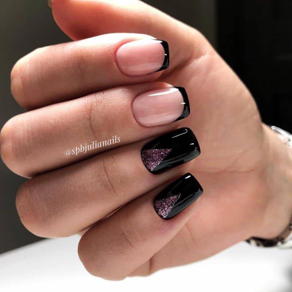- Прекрасным украшением темного маникюра станут блестки в виде пайеток, полосок или глиттера.