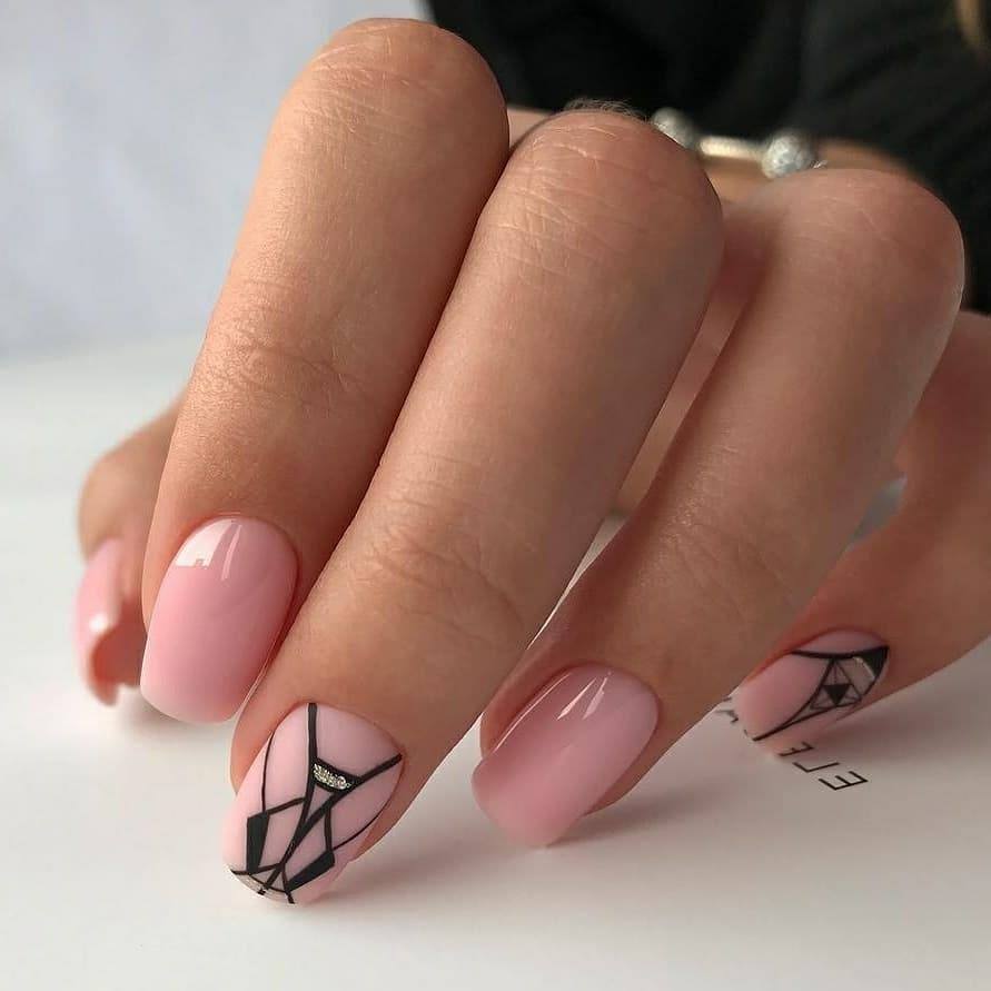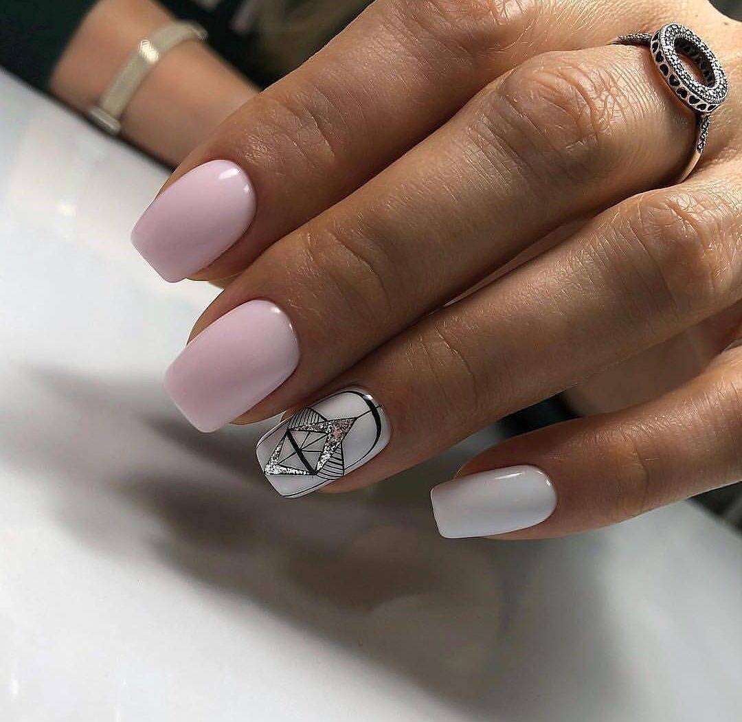 Минимализм в сочетании с геометрическим дизайном, самый популярный вид минималистичного маникюра. Но, геометрия здесь, должна быть лаконичной и легкой, с минимальным количеством геометрических фигур, точек, линий и каких-либо украшений.