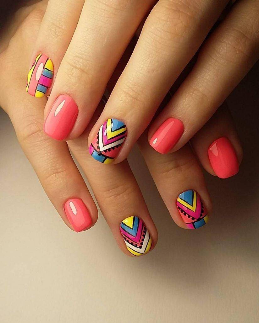 - слайдеры – выручают при создании летнего маникюра. Выполните декор на 1-2 акцентных ноготках, остальные ноготки покройте однотонным ярким гель-лаком.