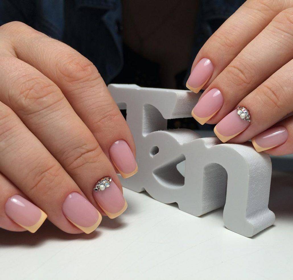 Маникюр на короткие ногти будет красивым, если нанести на ногтевую пластину прозрачную базу, а свободные края посыпать блёстками. Хрустальные бусинки в небольшом количестве остаются классикой жанра.