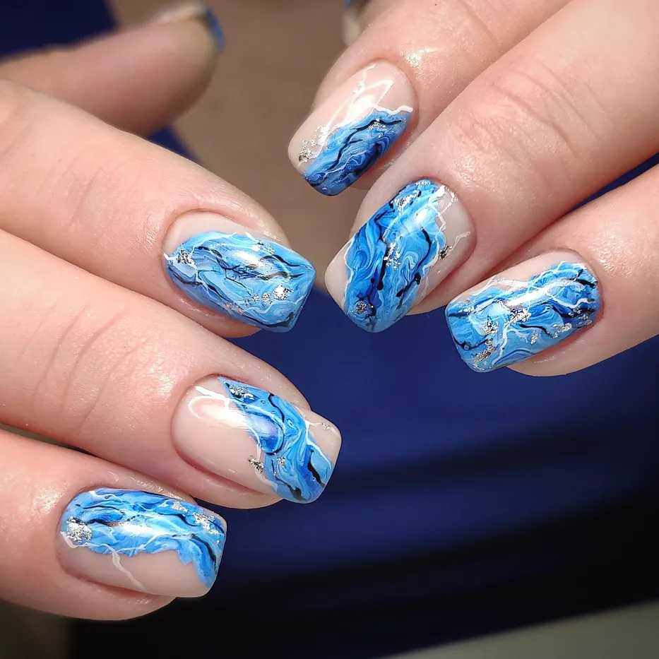 Мраморный эффект на ногтях — это один из самых горячих трендов. Сочетание синих оттенков с мраморными узорами создает стильный и элегантный вид.