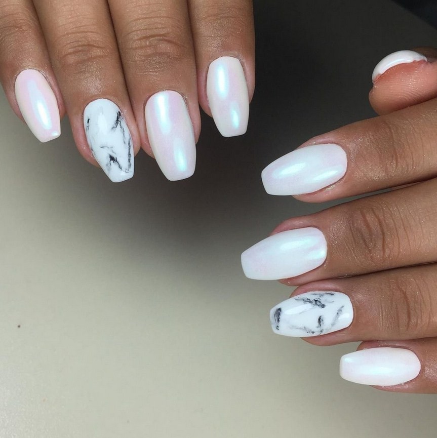 Путем втирки. Сочетание перламутрового покрытия и мраморного декора помогает создать очень женственный и нежный маникюр в одном дизайне. Поэтому стилисты рекомендуют не перегружать такие узоры глянцевой палитрой, а выбирать мягкие пастельные оттенки.