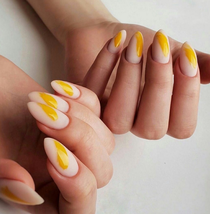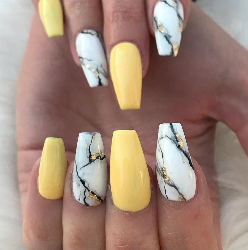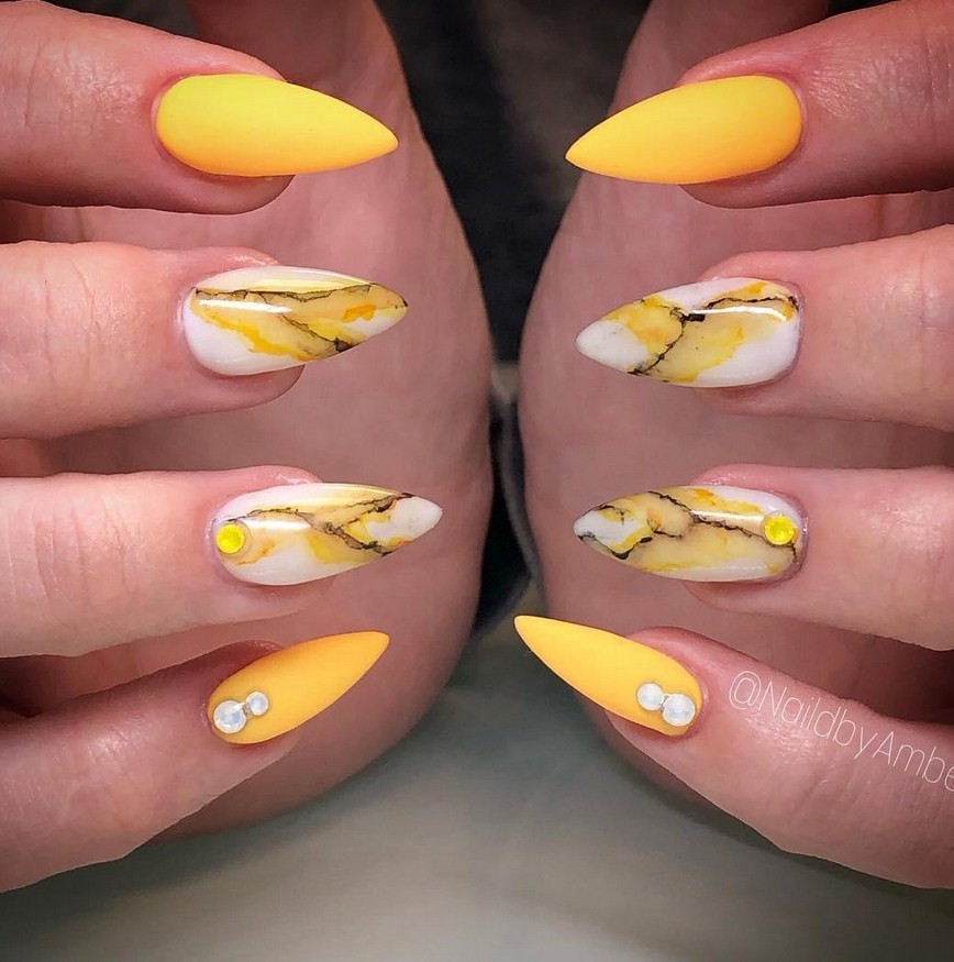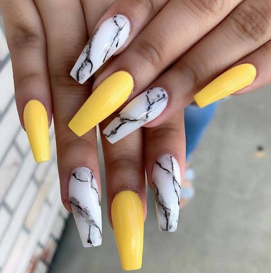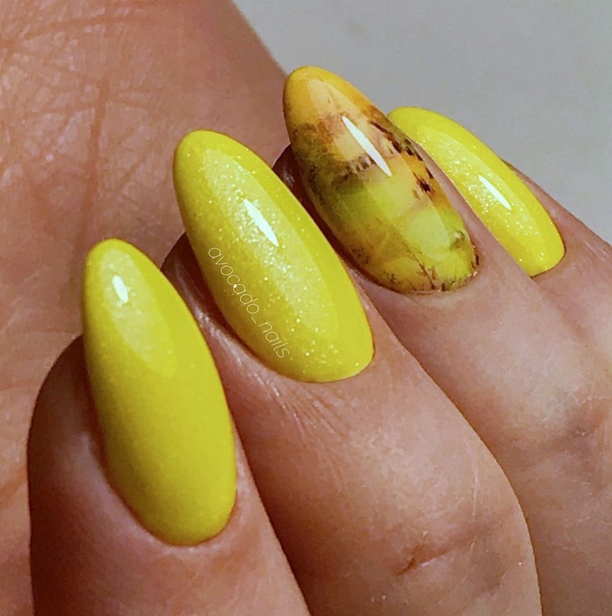 Жёлтый. Такой яркий цвет, как жёлтый, станет настоящей изюминкой образа. Он прекрасно комбинируется с коричневым и терракотовым в мраморной технике.