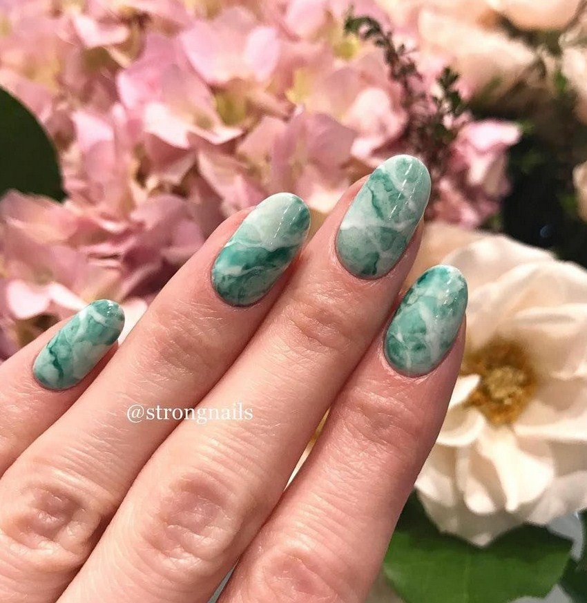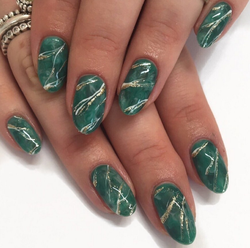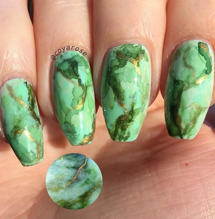 Не менее эффектно выглядят разводы зеленого цвета, с помощью которого можно получить имитацию драгоценного камня малахита. Стильно смотрится синий маникюр в “стоун” стиле. Для смешивания гель-лаков используется вода. Опустив пальчик в воду, можно увидеть, как он моментально обволакивается лаковой пленкой.