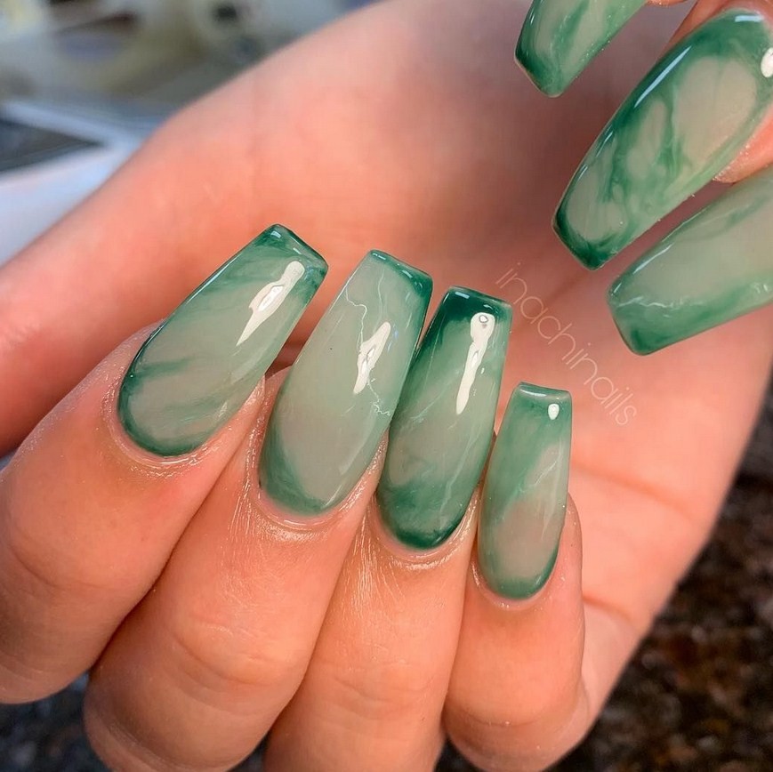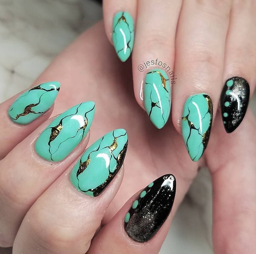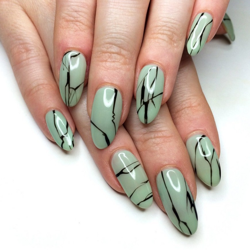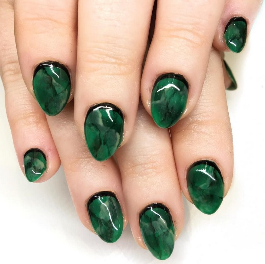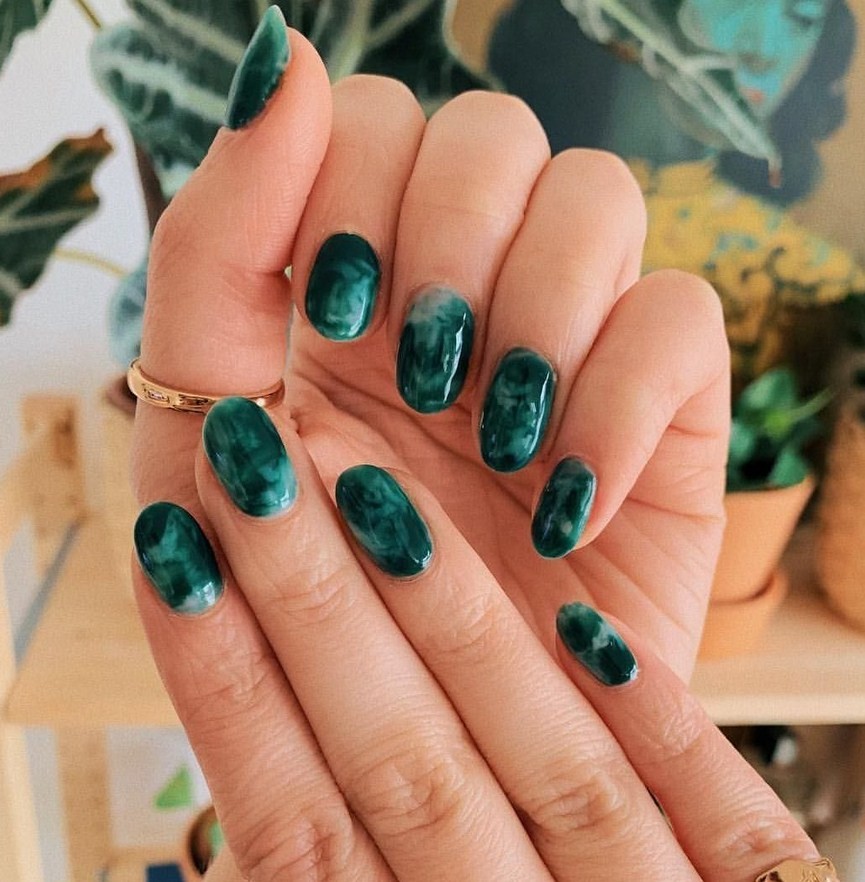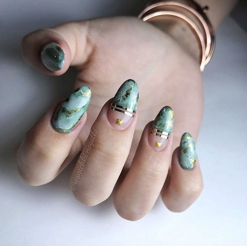 Зелёный. Самым популярным считается дизайн ногтей малахит, который повторяет текстуру натурального камня. Также можно применять мраморные техники с изумрудным, травяным, болотным, бирюзовым цветами.
