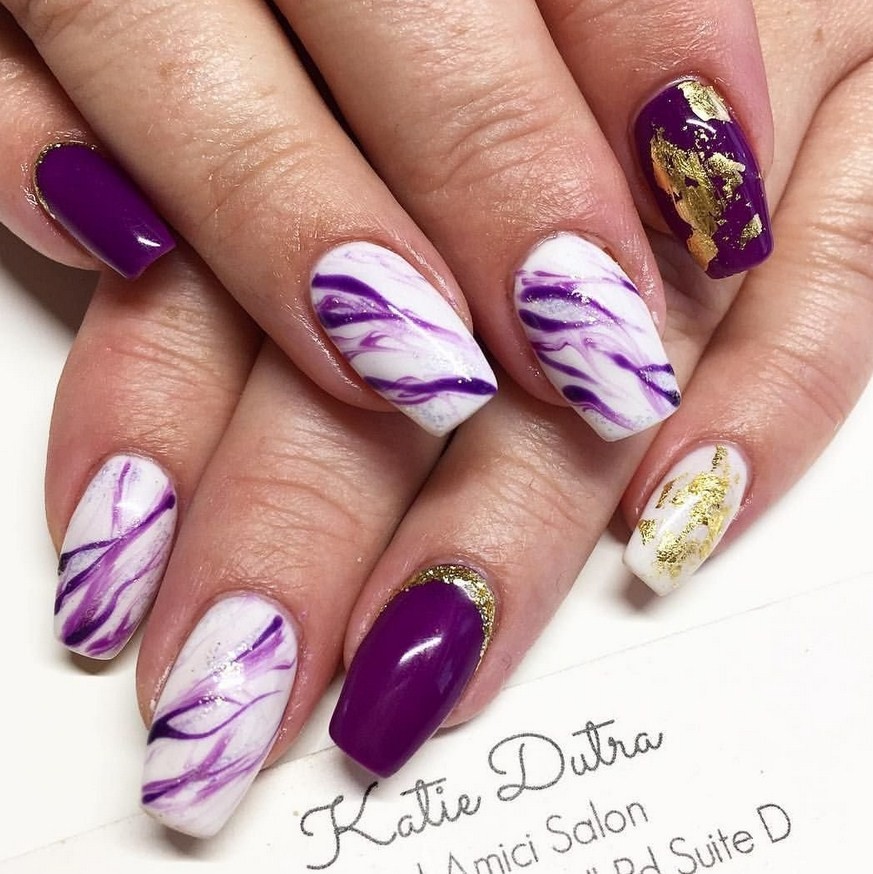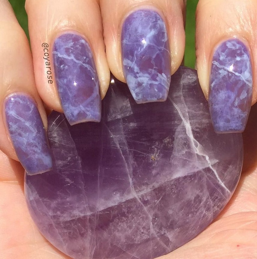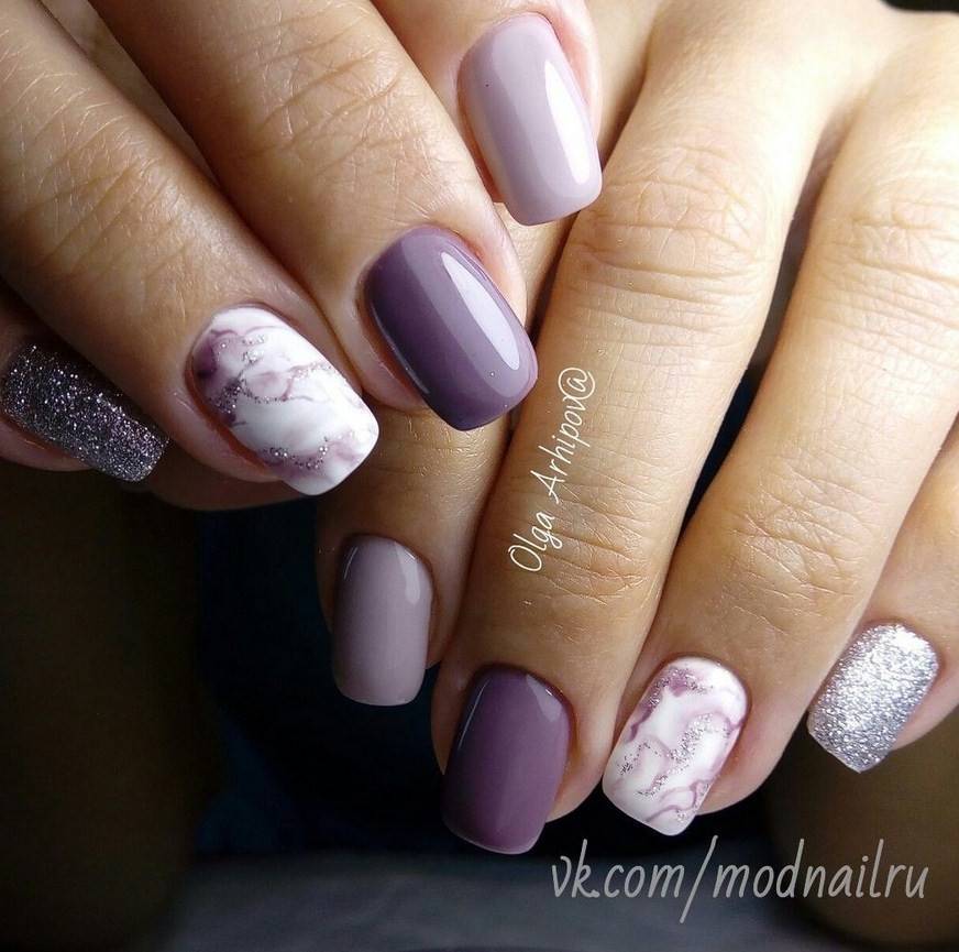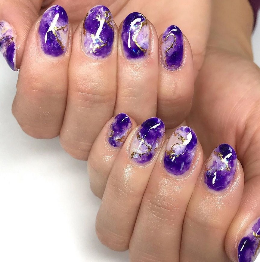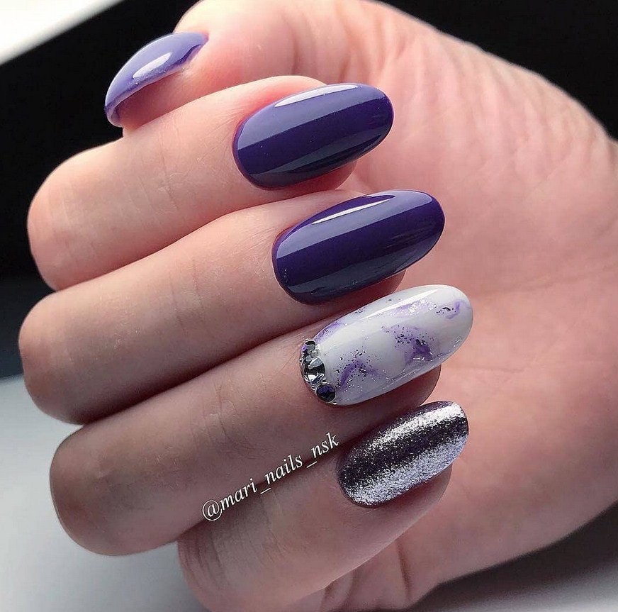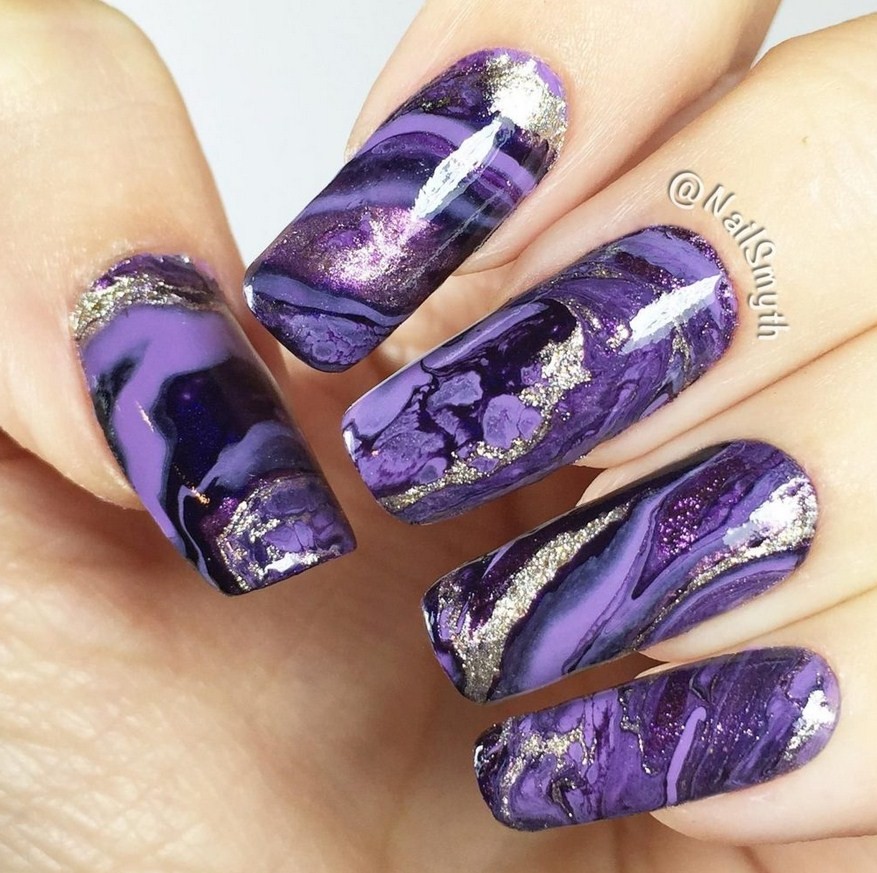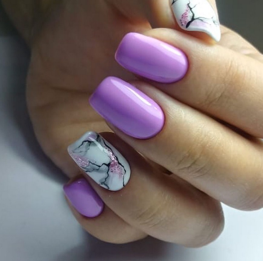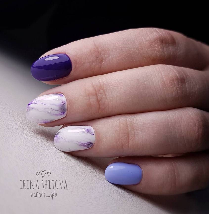 Маникюр фиолетовый мрамор. Один из самых шикарных видов дизайна. Специалисты рекомендуют выбирать его для торжественных событий, праздников, дополняя белыми или голубыми разводами.