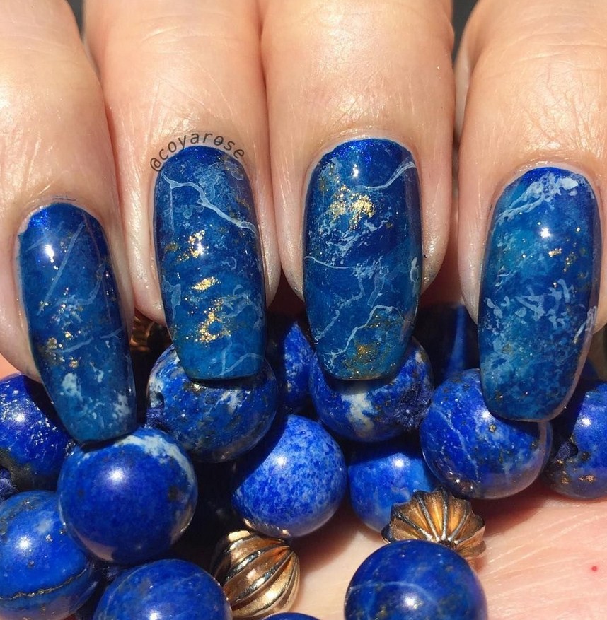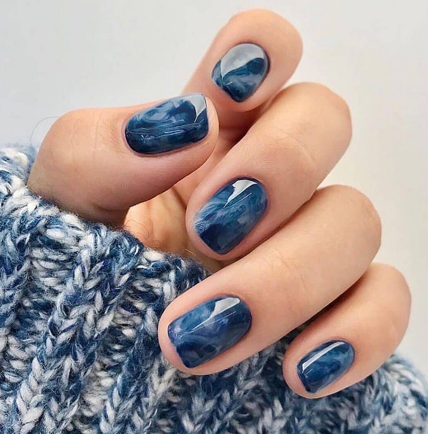 Синий. Глубокий тон, который никогда не выходит из моды. Если чёрный кажется мрачным, синий отлично его заменит. Прожилки лучше делать белым, бежевым, серебряным лаком.