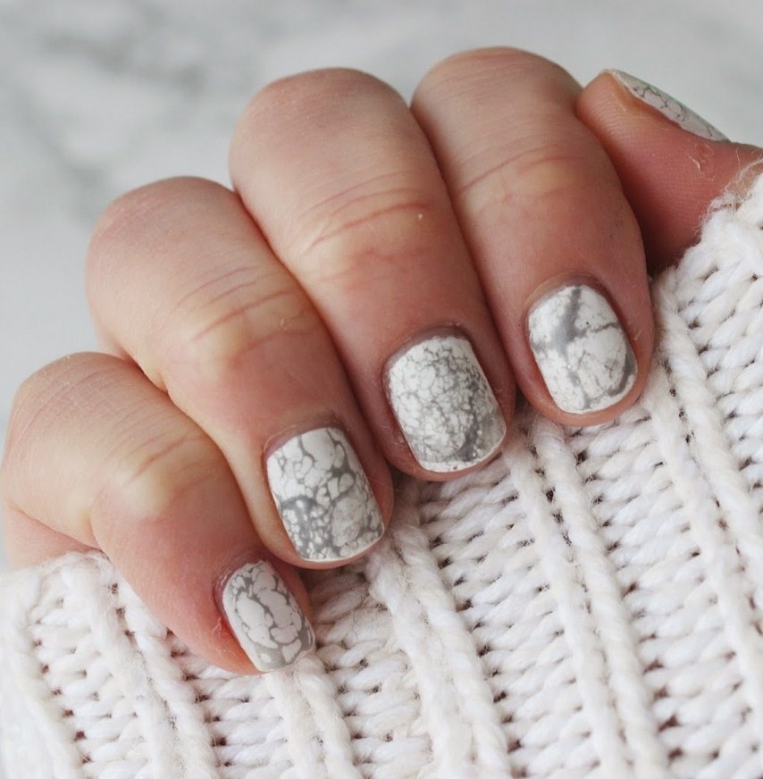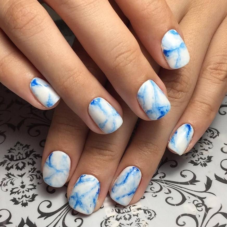 Использование гель-лака создающий эффект мраморной крошки, это пожалуй, один из самых простых способов оформить ноготки в домашних условиях. Обычно используются лак черного, синего и белого цвета. Белый мраморный маникюр выглядит очень стильно и отлично подходит для повседневного образа.