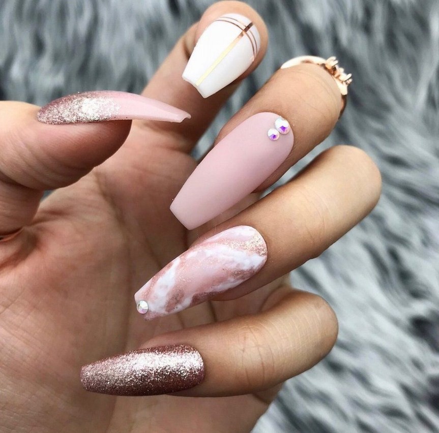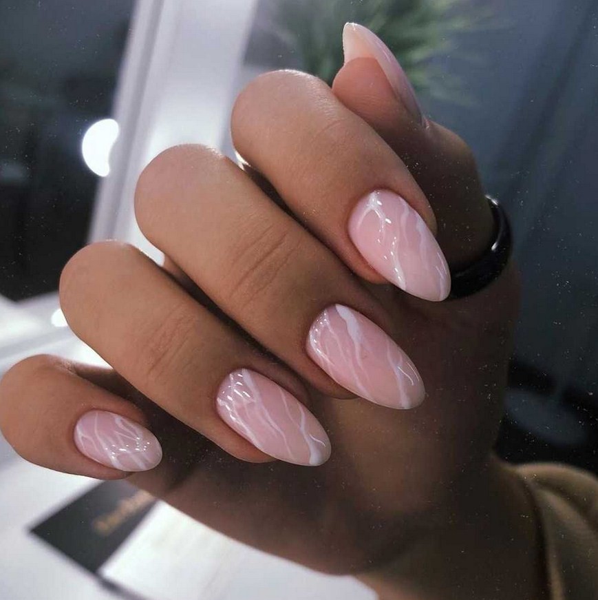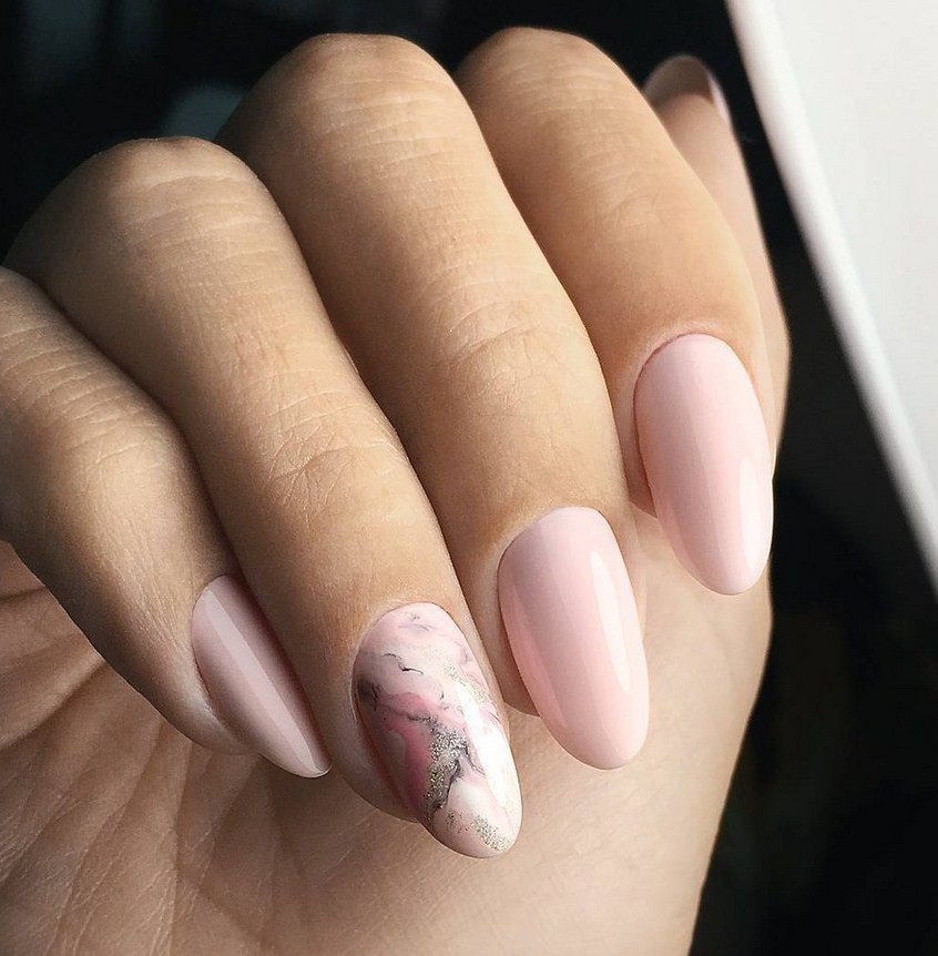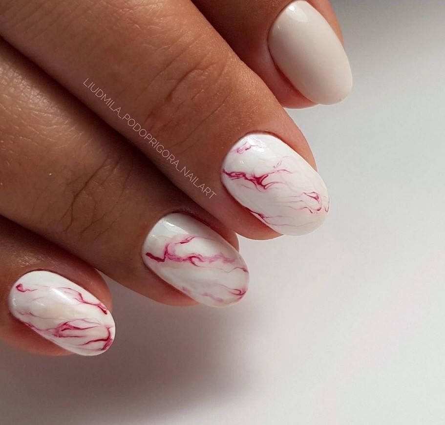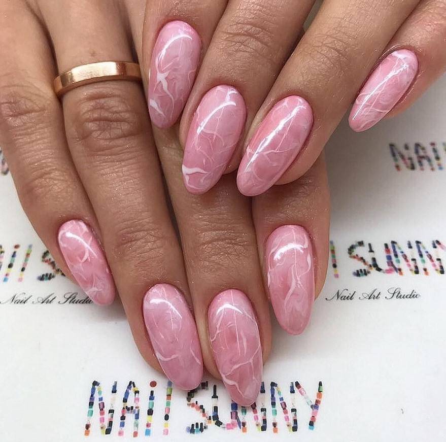 Модницам особенно нравятся пастельные тона – белый, бежевый или розовый. За счет «мягкого» внешнего вида эффект мрамора на такой подложке подойдет женщинам любого возраста и образа жизни – строгим дамам, кокетливым девушкам и спортсменкам. За основу дизайна можно взять и яркие оттенки или поэкспериментировать с различными техниками и декором.