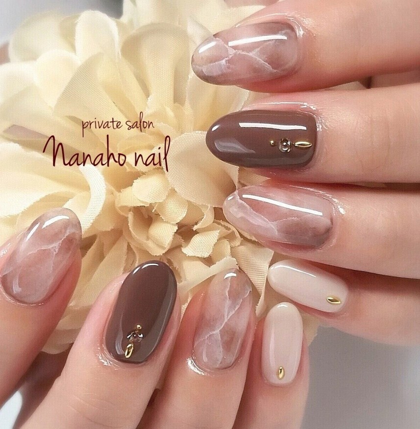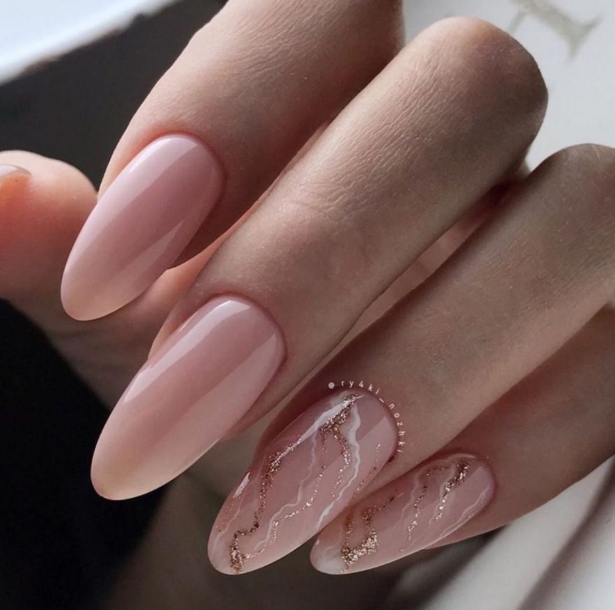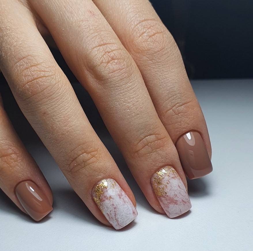 Хорошей идеей будет использовать бежевый цвет в тандеме с характерным каменным узором. Такой нежный и изящный дизайн прекрасно дополнит как повседневный образ, так и торжественный. Для особого мероприятия ноготки стоит украсить стразами или втиркой.