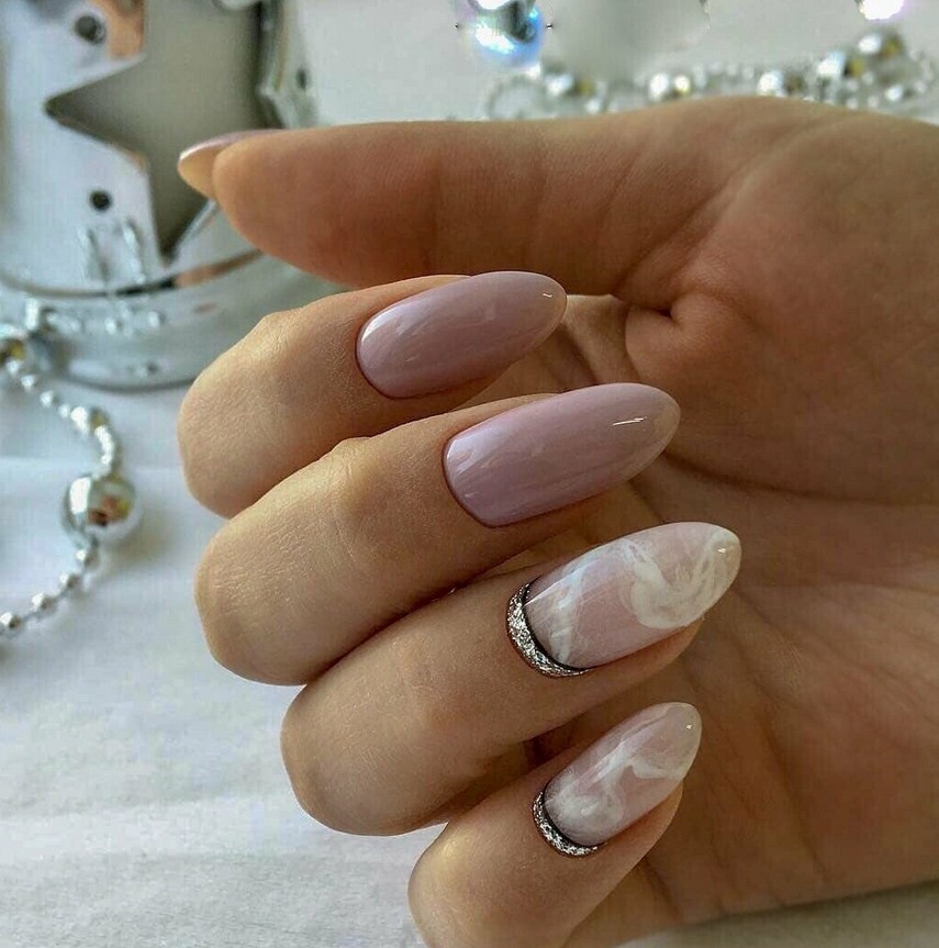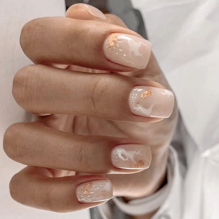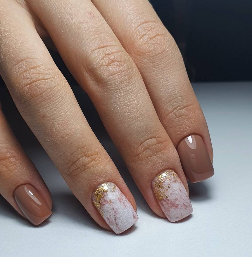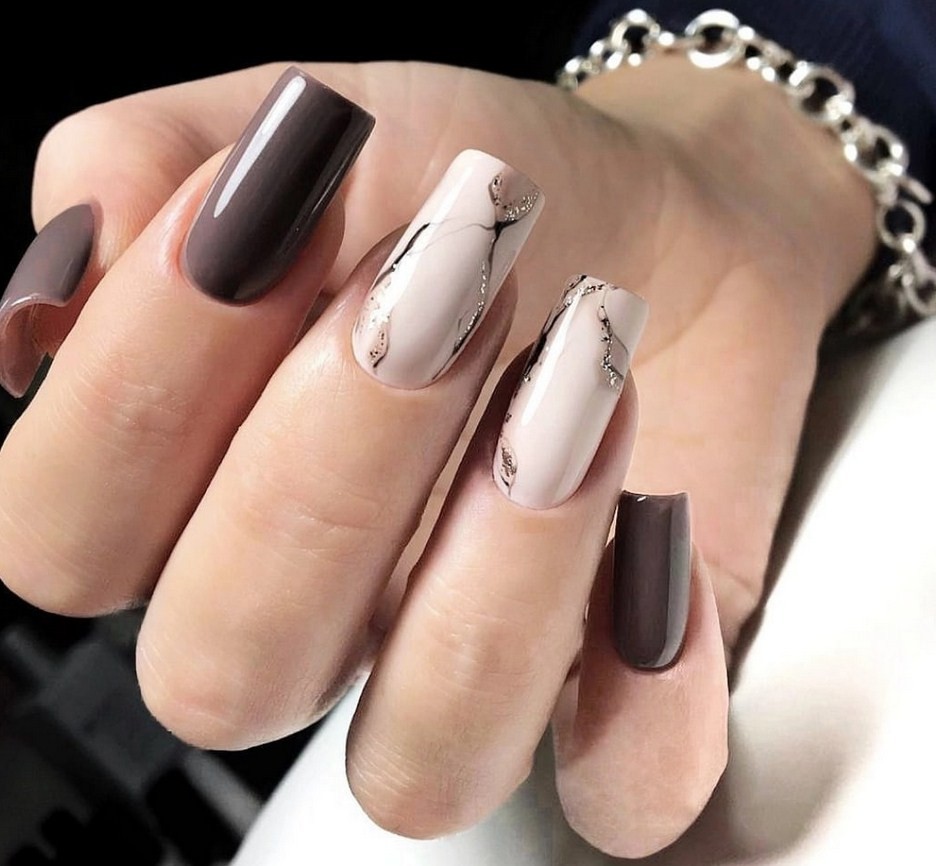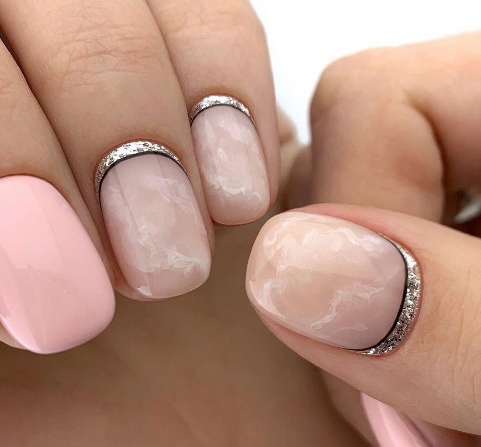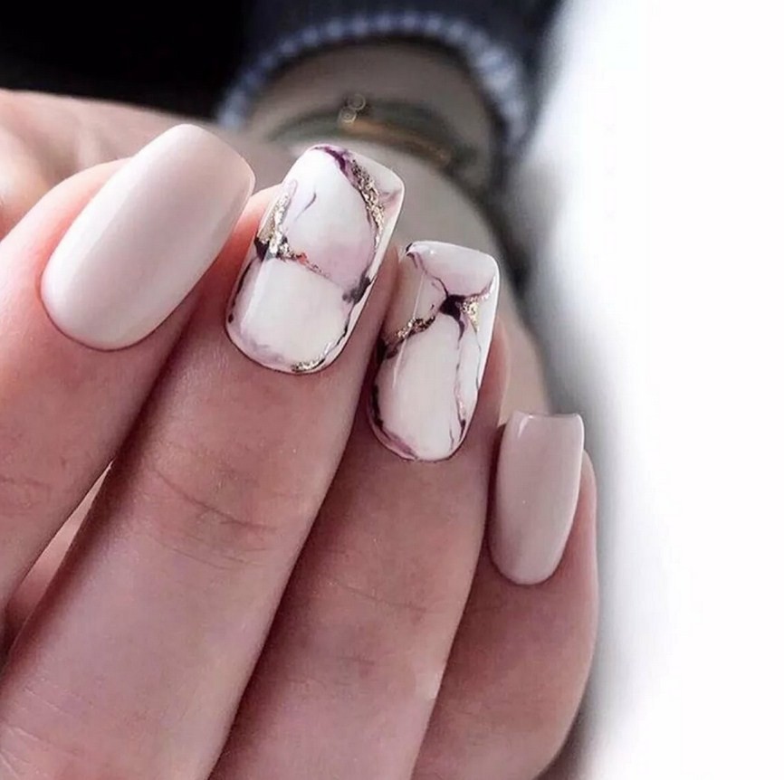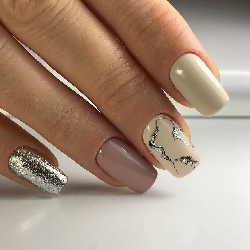 Бежевый мрамор. При разбавлении серебристыми или белыми линиями беж будет выглядеть ещё более стильно и нежно. Он хорош для повседневной носки, а также для оформления коротких ноготков.