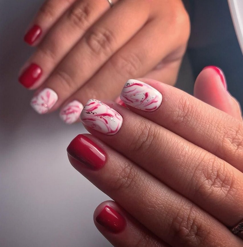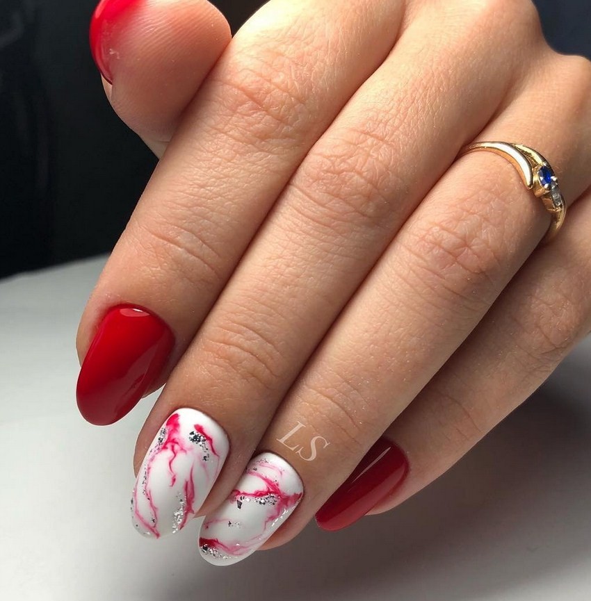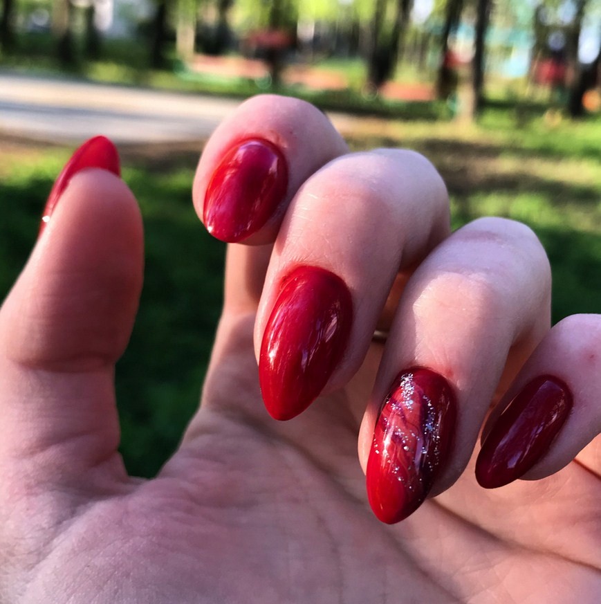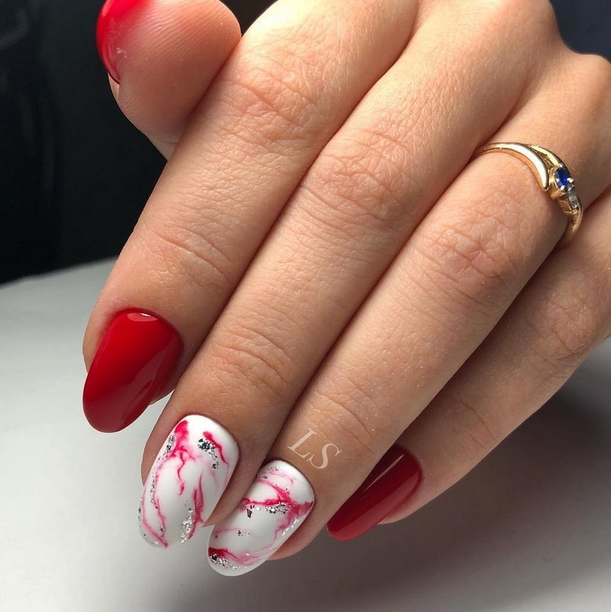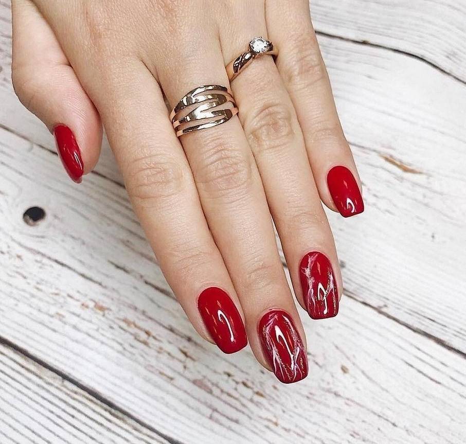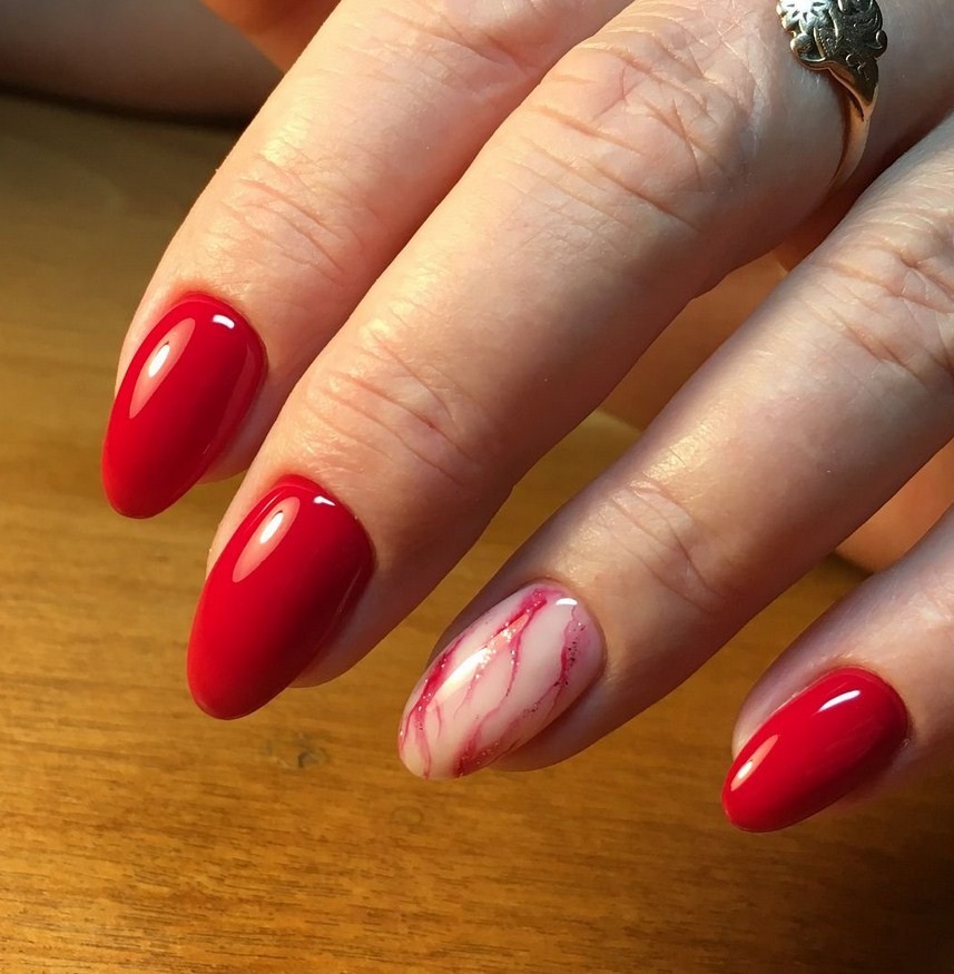 Красный мрамор на ногтях. Красный – цвет страсти. Такой дизайн выглядит очень смело, его предпочитают решительные женщины. При разбавлении черным или белым красный в маникюре немного утрачивает яркость и становится более спокойным.