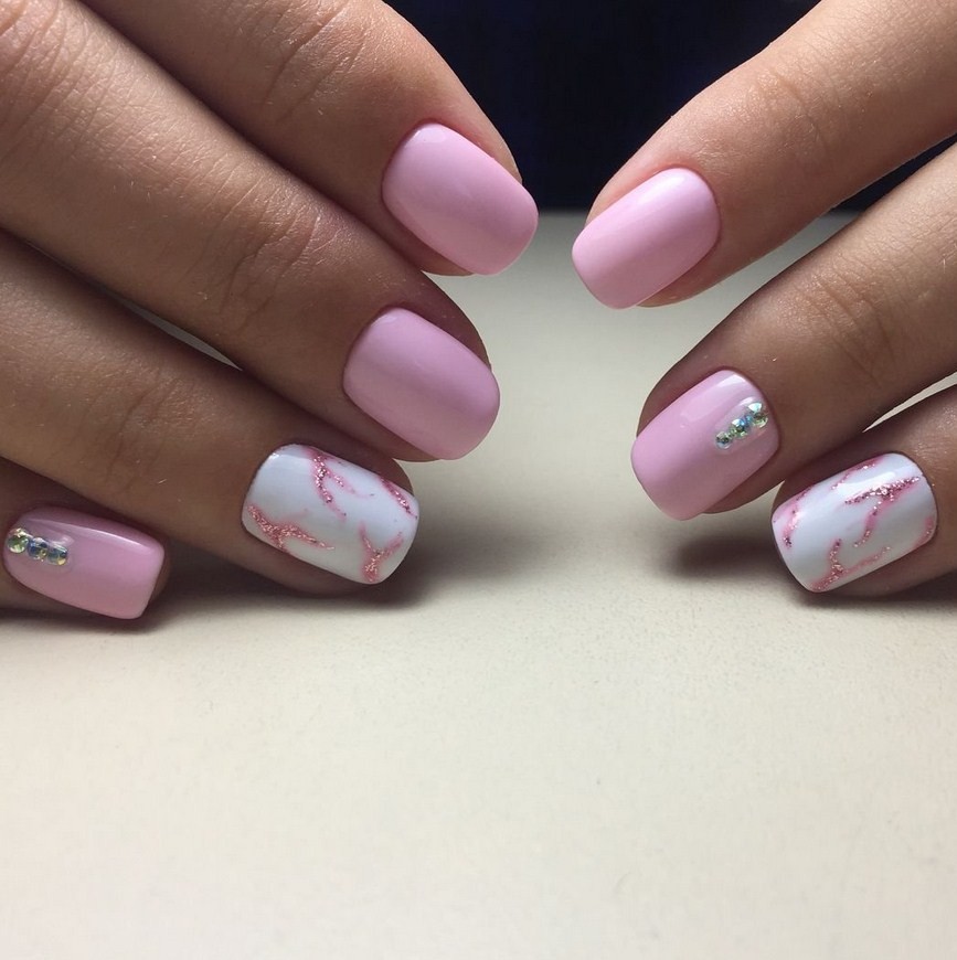 «Розовый нефрит». Этот вариант подходит для тех, кто хочет экспериментов. Это может быть светло-розовая основа, а сверху нанесены белые, светло-серые или серебристые линии. Другой вариант — ярко-розовые линии на черном, сером или бежевом фоне в сочетании с мелкими блестками или стразами.