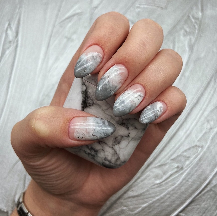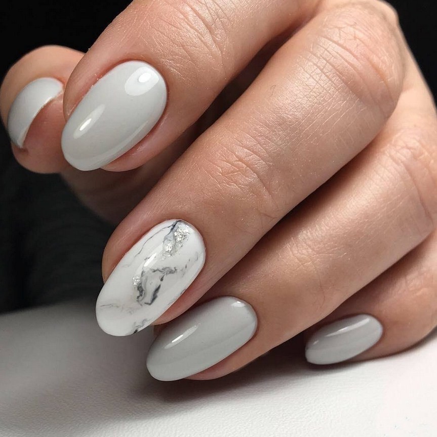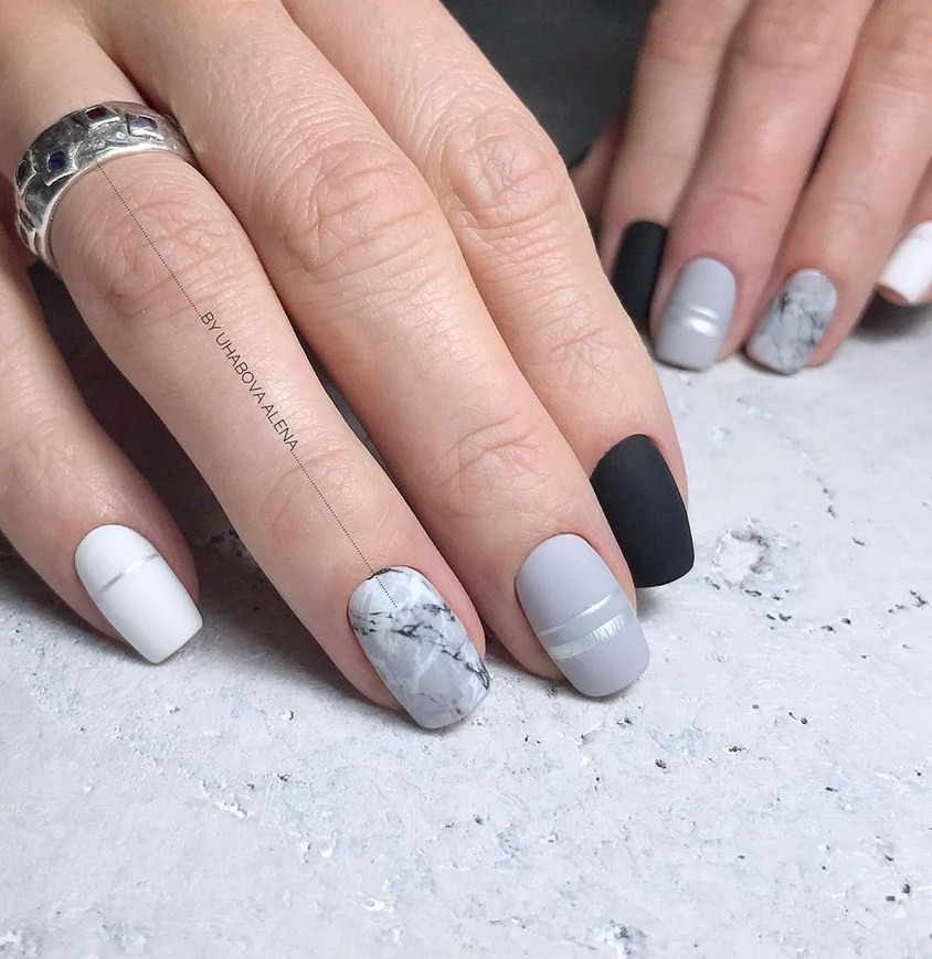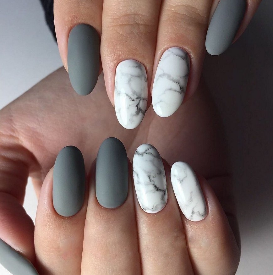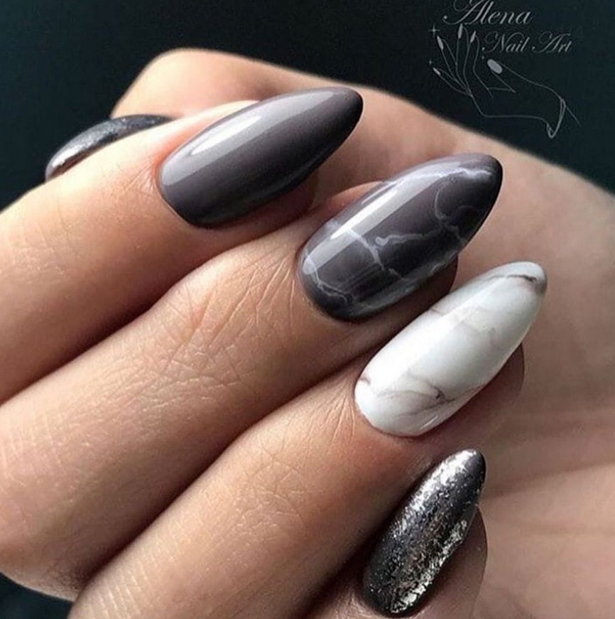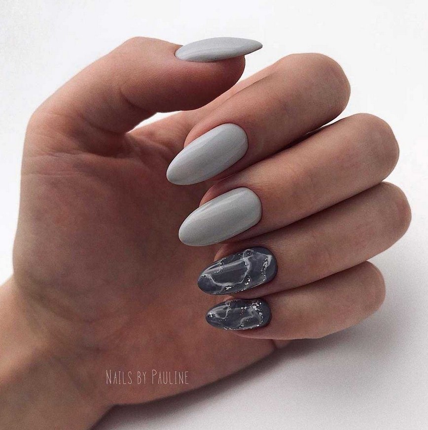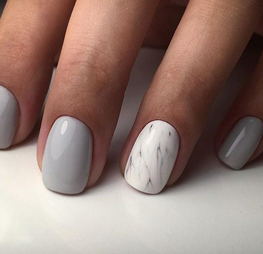 Благодаря тому, что серый входит в список базовых цветов мраморного нейл-дизайна, различные вариации этого маникюра в серых тонах просто не могут смотреться неудачно