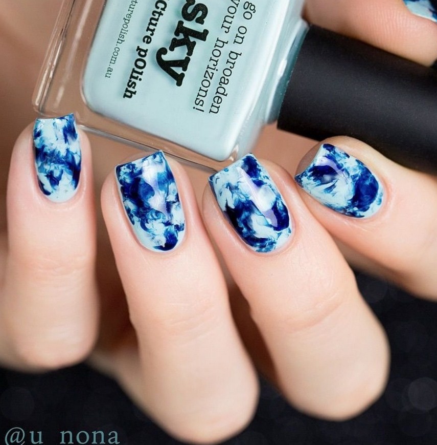 Вода + зубочистка. Благодаря наслоению лаков разных цветов на поверхности воды в результате получается оригинальный рисунок, чем-то напоминающий каменную поверхность. Нужно только поочередно в емкость с водой капать лак и после, используя зубочистку создать желаемый рисунок. В конце ноготь следует окунуть в воду и перенести не него готовый декор.