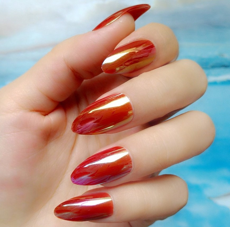 - Нанести на ногти лак с эффектом металлик. Лучше покрытие выполнить в градиентной технике, нанося несколько оттенков с оформлением перехода от одного к другому при помощи плотной кисти для маникюра.
