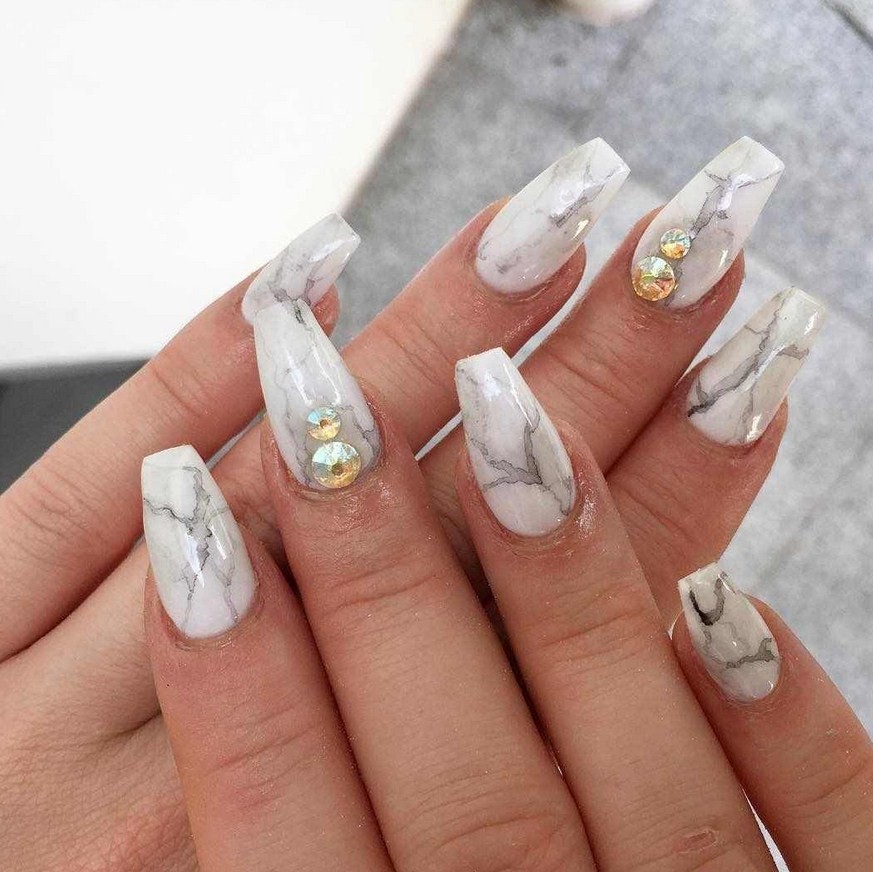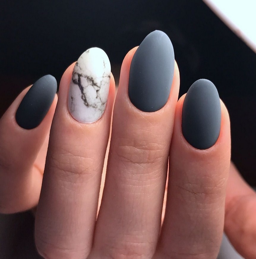 Такие ногти всегда привлекут к себе внимание. Чаще всего эффект камня делают контрастным основному цвету, поэтому в качестве базы подойдет белый или серый цвет