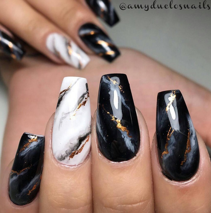 Стильное мраморное покрытие ногтей с золотом