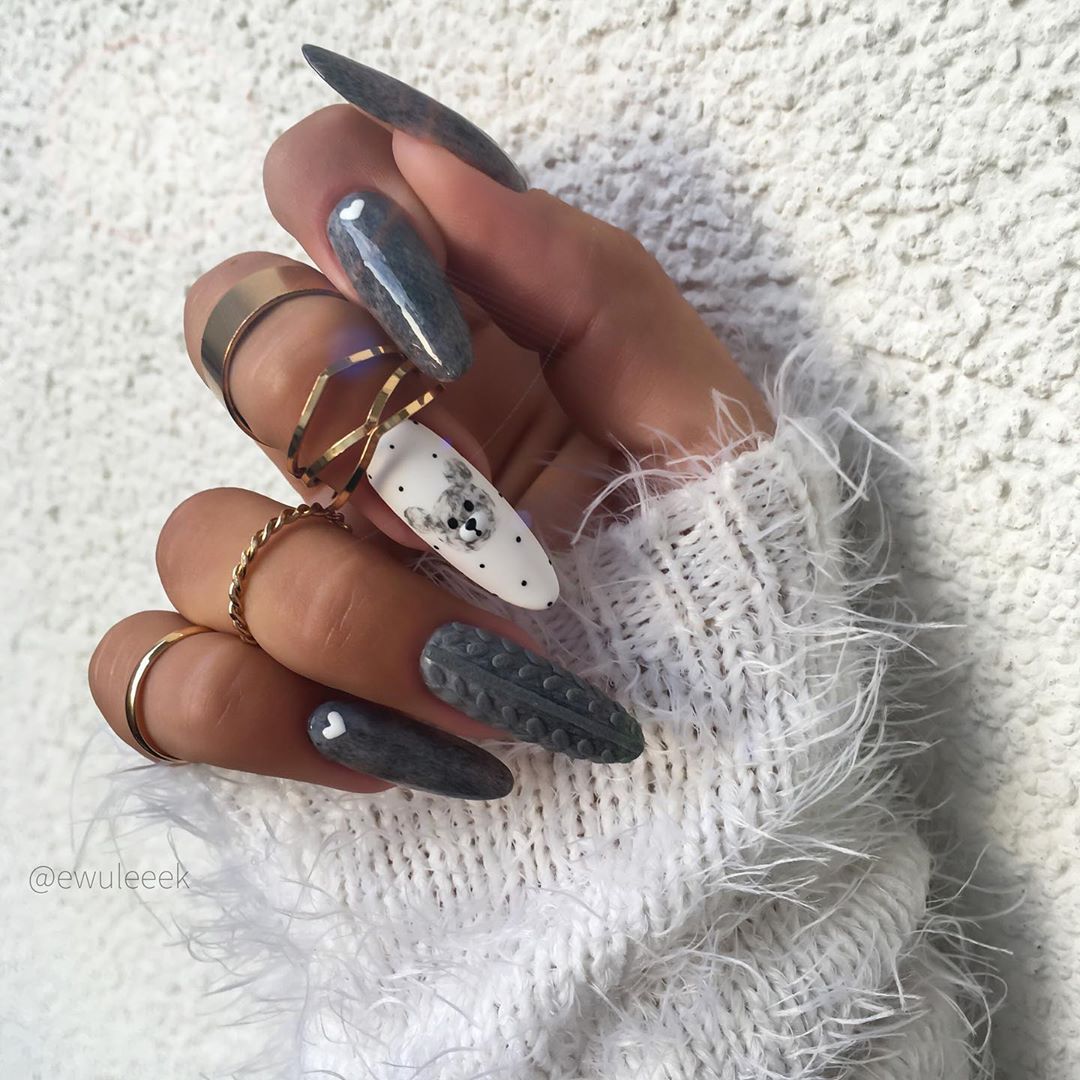 При этом весьма интересно выглядят и привлекают внимание не только дуэтные сочетания серого с белым или чёрным, но и оригинальные трио, в состав которых входят как базовые, так и любые другие оттенки, например, розовый. Это могут быть лаконичные и сдержанные идеи оформления, в которых узоры наносятся непосредственно на серое основание, а могут быть различные комбинированные идеи с цветными мраморными разводами, стразами, фольгой и прочими дополнениями